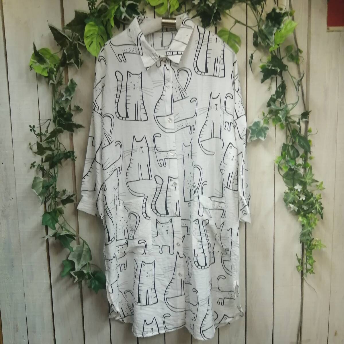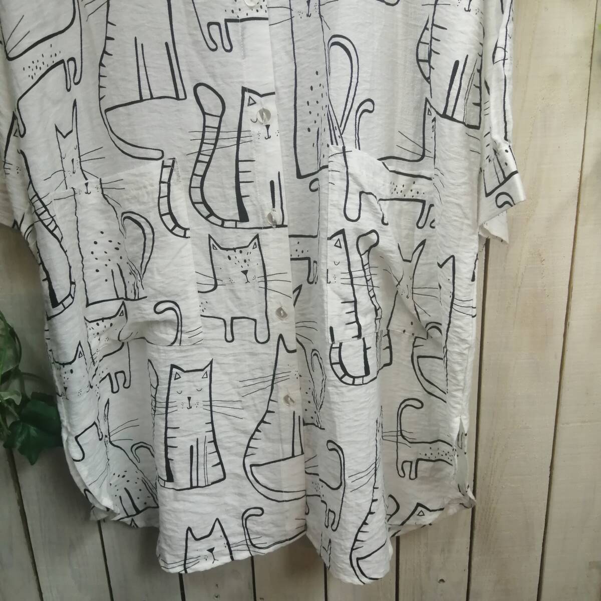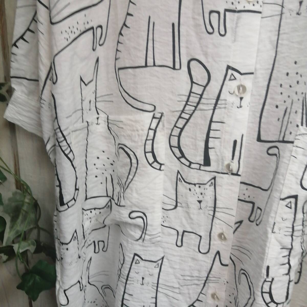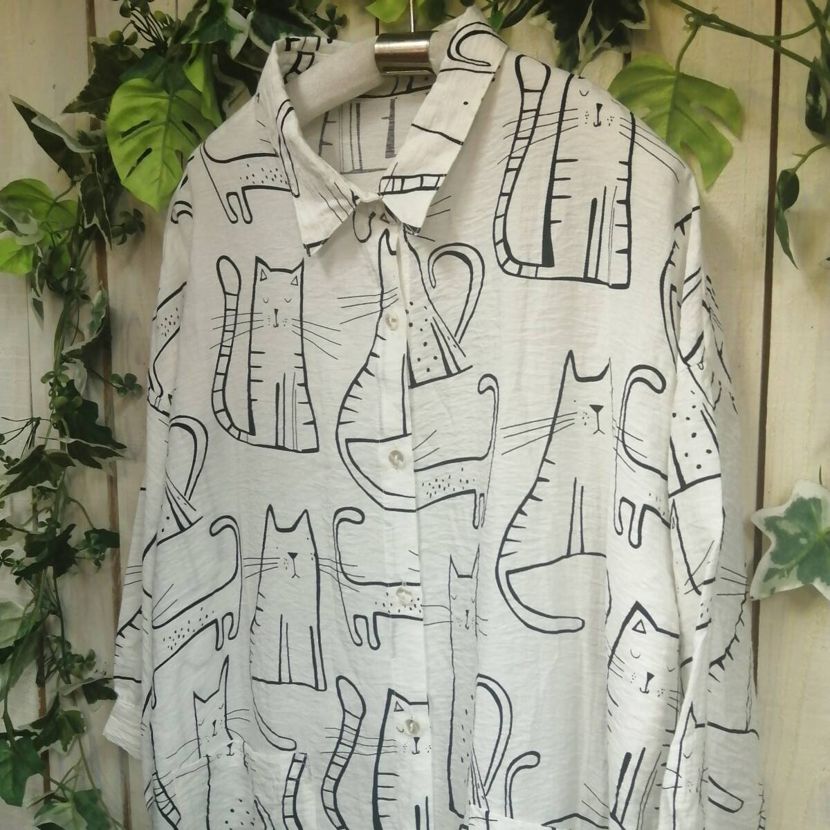 ★C310★noa-ge★ノアージュ★ねこ柄プリント★ロング★ブラウスシャツ★前開き★長袖★サイズL レーヨン77%