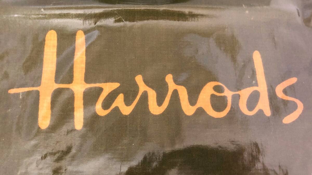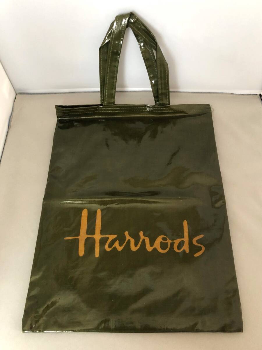 イギリスの老舗デパート、Harrodsのバッグです。とても上品なグリーンにHarrodsのロゴが映えています。雨なども拭き取りやすい素材です。