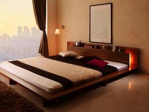 モダンライト・コンセント付き大型ローベッド プレミアムボンネルコイルマットレス付き ダブル【フレームカラー:ウォルナットブラウン】【寝具カラー:ブラック】です。