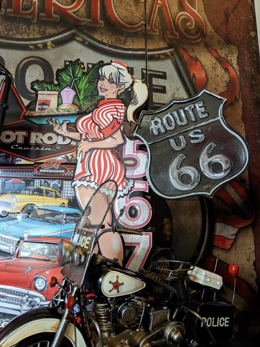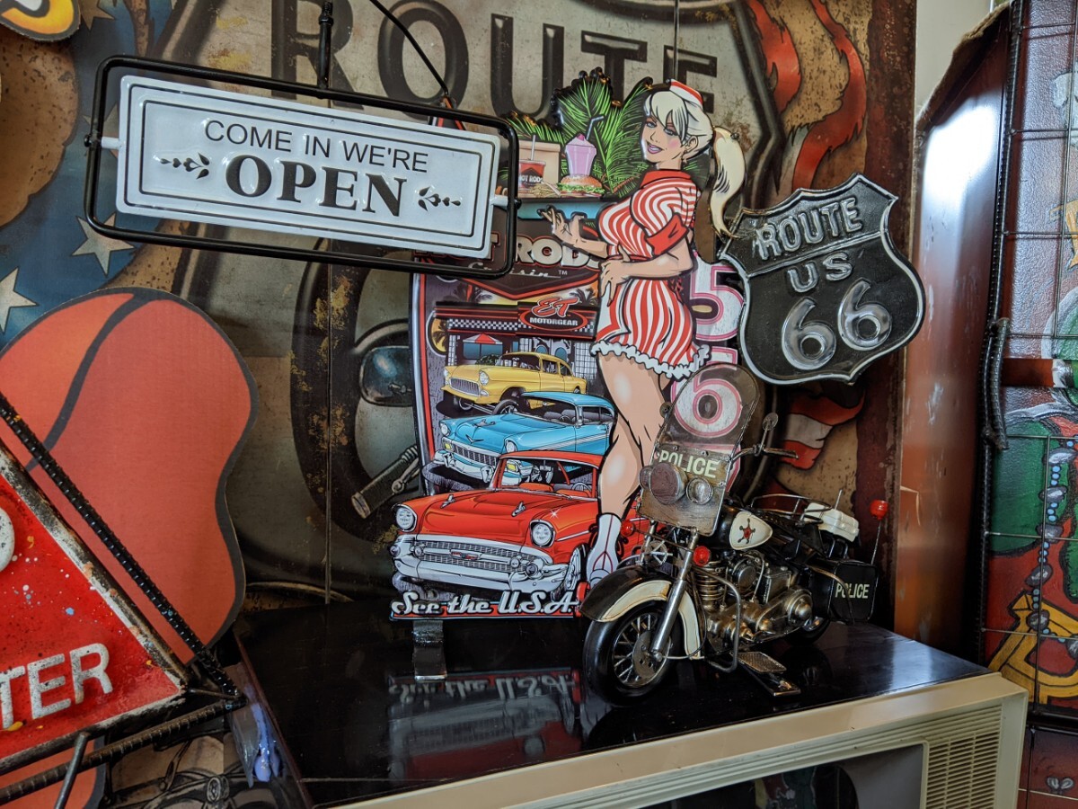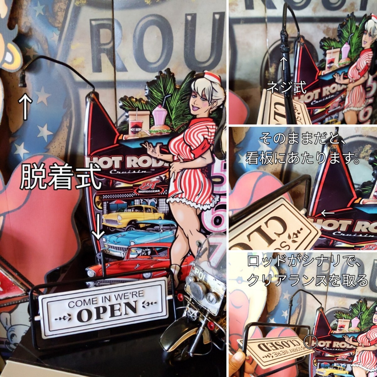 ※画像にあるオープン看板は脱着式、その他バイク、ルート66は、固定しています。