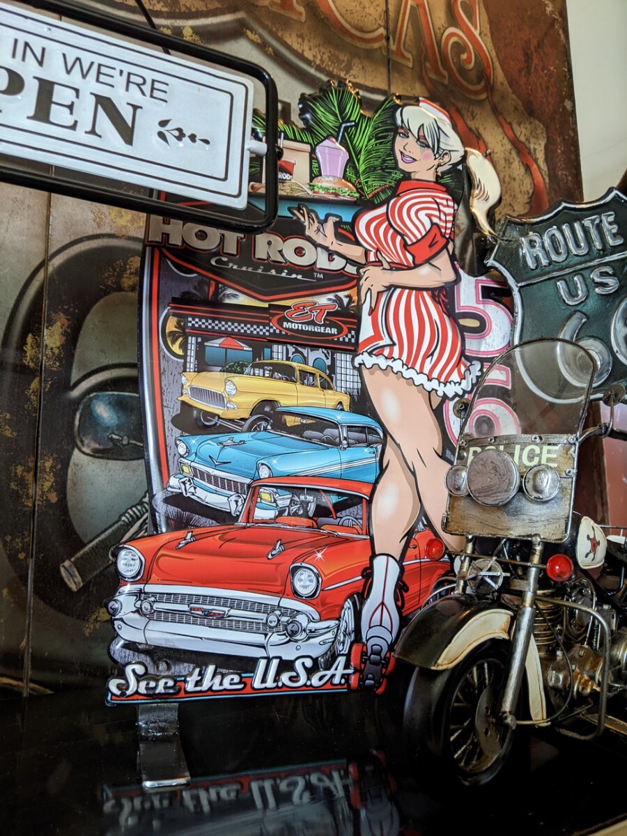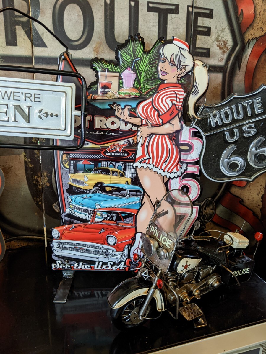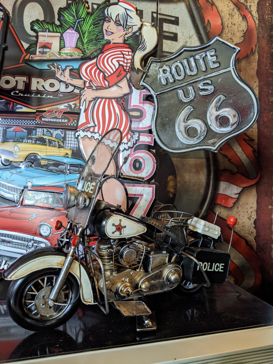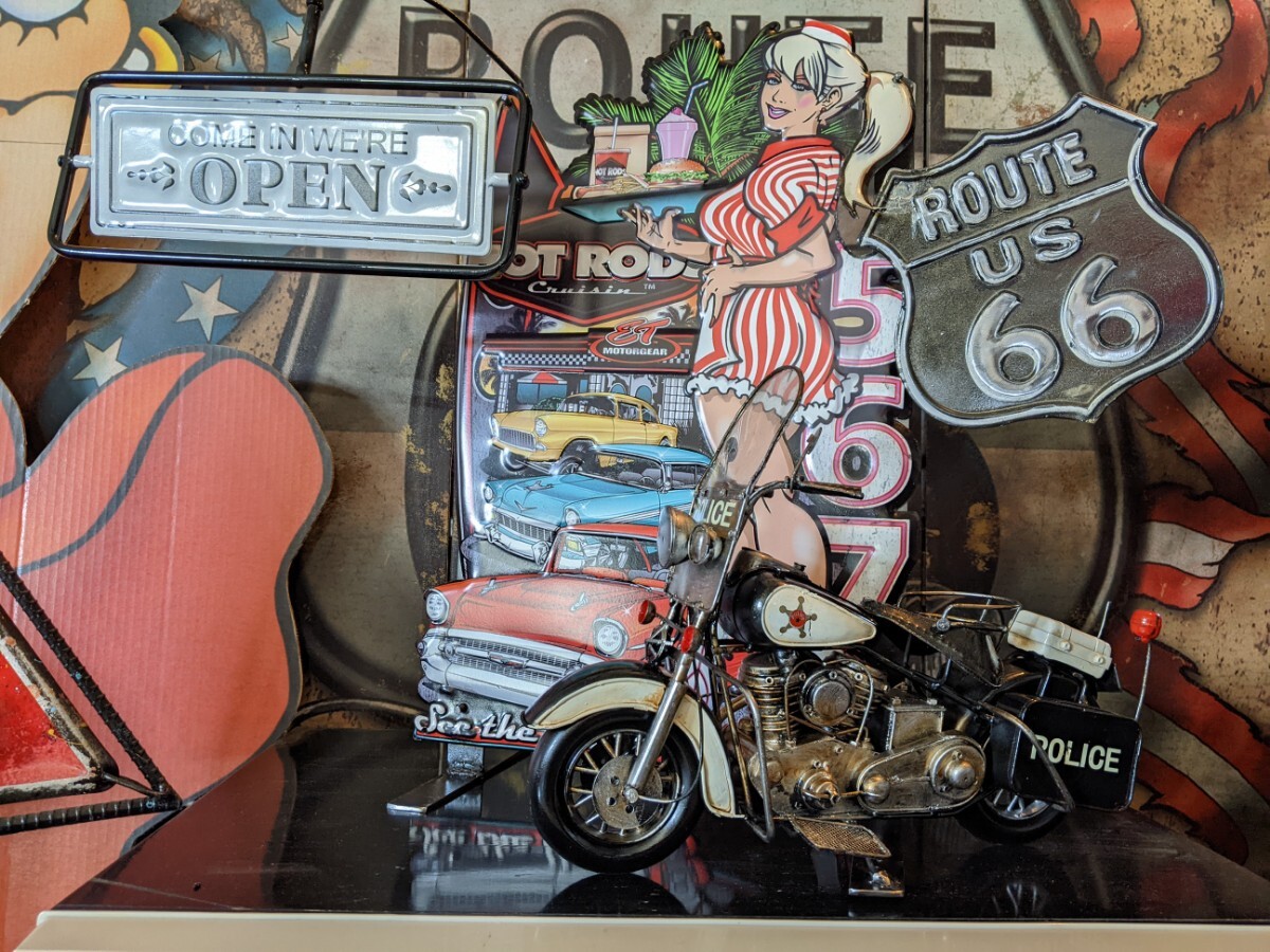 アメリカンダイナーのクラッシックなプロモーション看板に年代の合ったポリスバイクが キマってます!!
