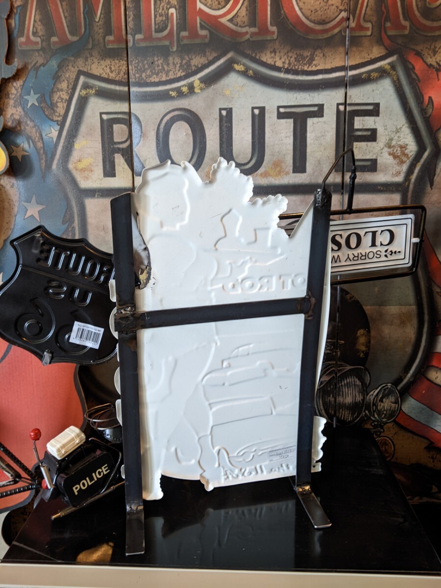 ショップに限らず、アメリカン雑貨を愛する方なら、カッチョ良く演出できるアイテムで、ブリキ看板は、市販化の為、デザインを決める工程での試作品となりますので、世に出回るか否かは未定な品です。