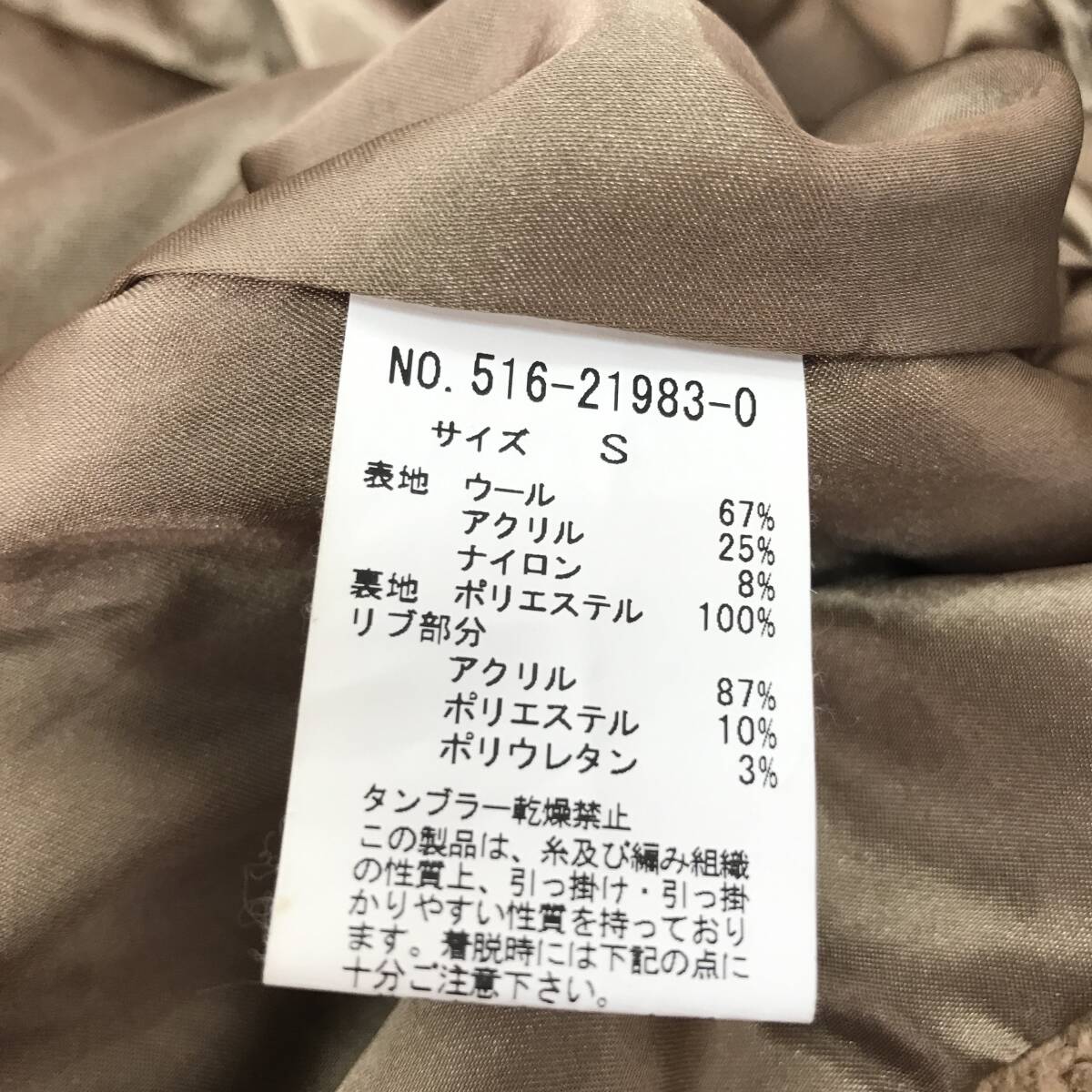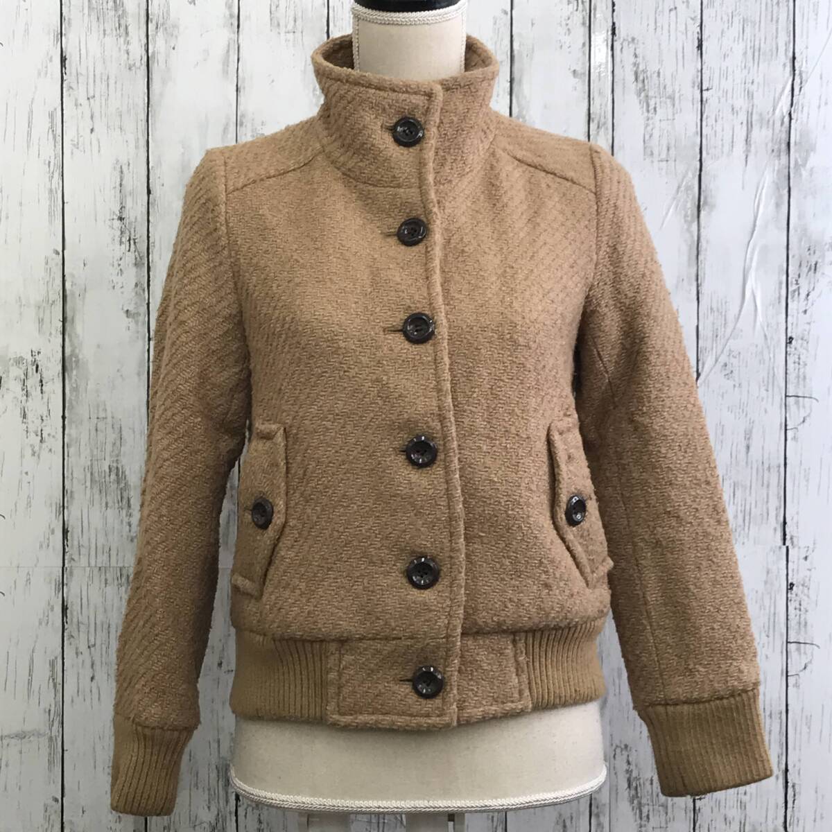 | 商品説明 | 商品名/ショートコート サイズ/S 着丈53cm身幅45cm肩幅33cm袖丈56cm 素材/表地・ウール67%アクリル25%ナイロン8% 裏地・ポリエステル100% リブ部分・アクリル87%ポリエステル10%ポリウレタン3% 商品状態/前左ポケット~裾汚れ、全体毛玉 |