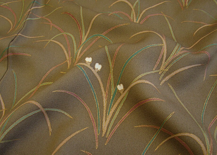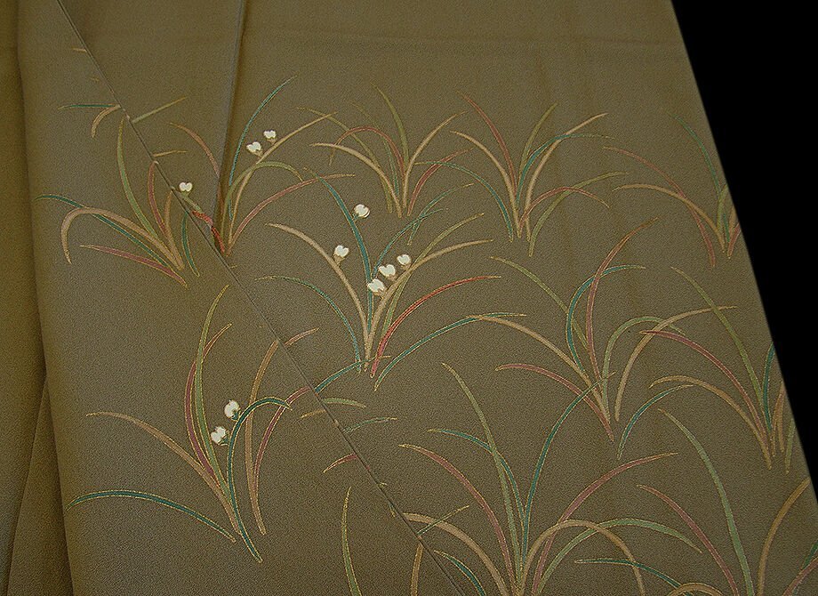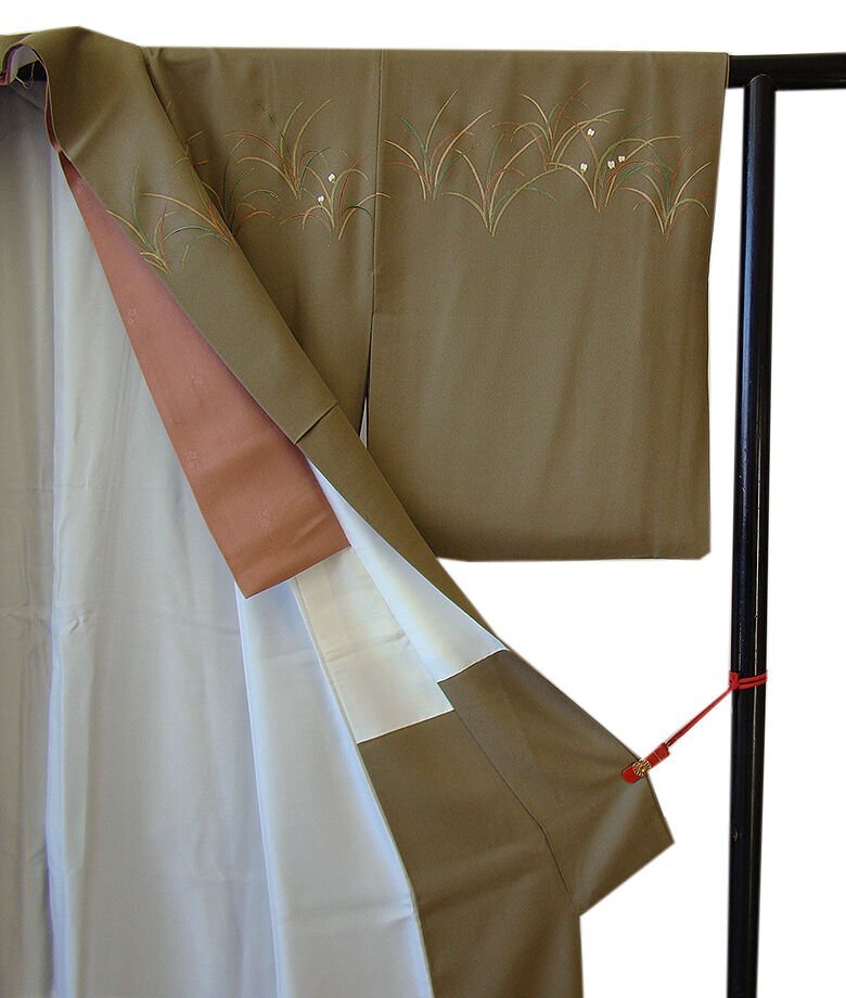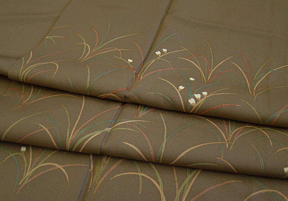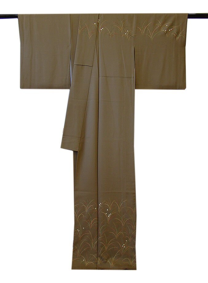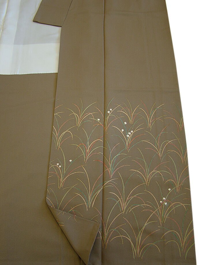 商品説明 | こちらのお品は「袷」ですので10月から5月までお召頂ければと思います。 しなやかな手触りの着心地良い重めの一越地の生地、 落ち着きある渋い媚茶色地に紅梅、水柿、白緑、水色等の草木柄の染柄に金彩加工仕立て、 共八掛(正絹)、退紅色地地模様入りの重ね衿付きとなっております。 |