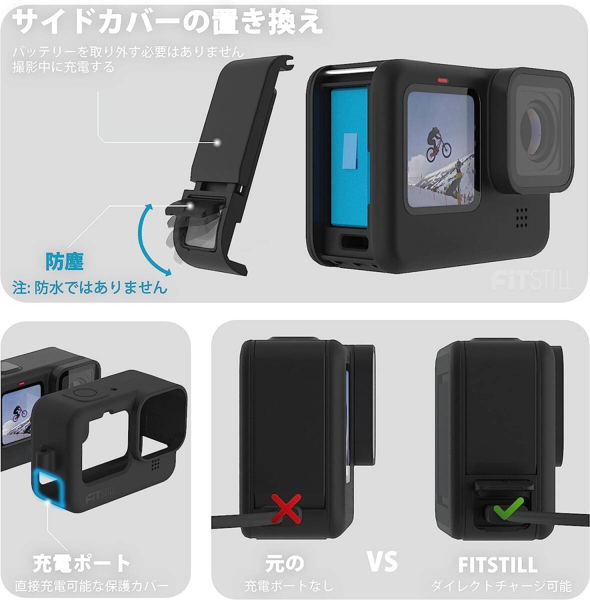注意:このサイドカバーは防水ではありません。カメラを水から遠ざけ、水中での使用は避けてください。