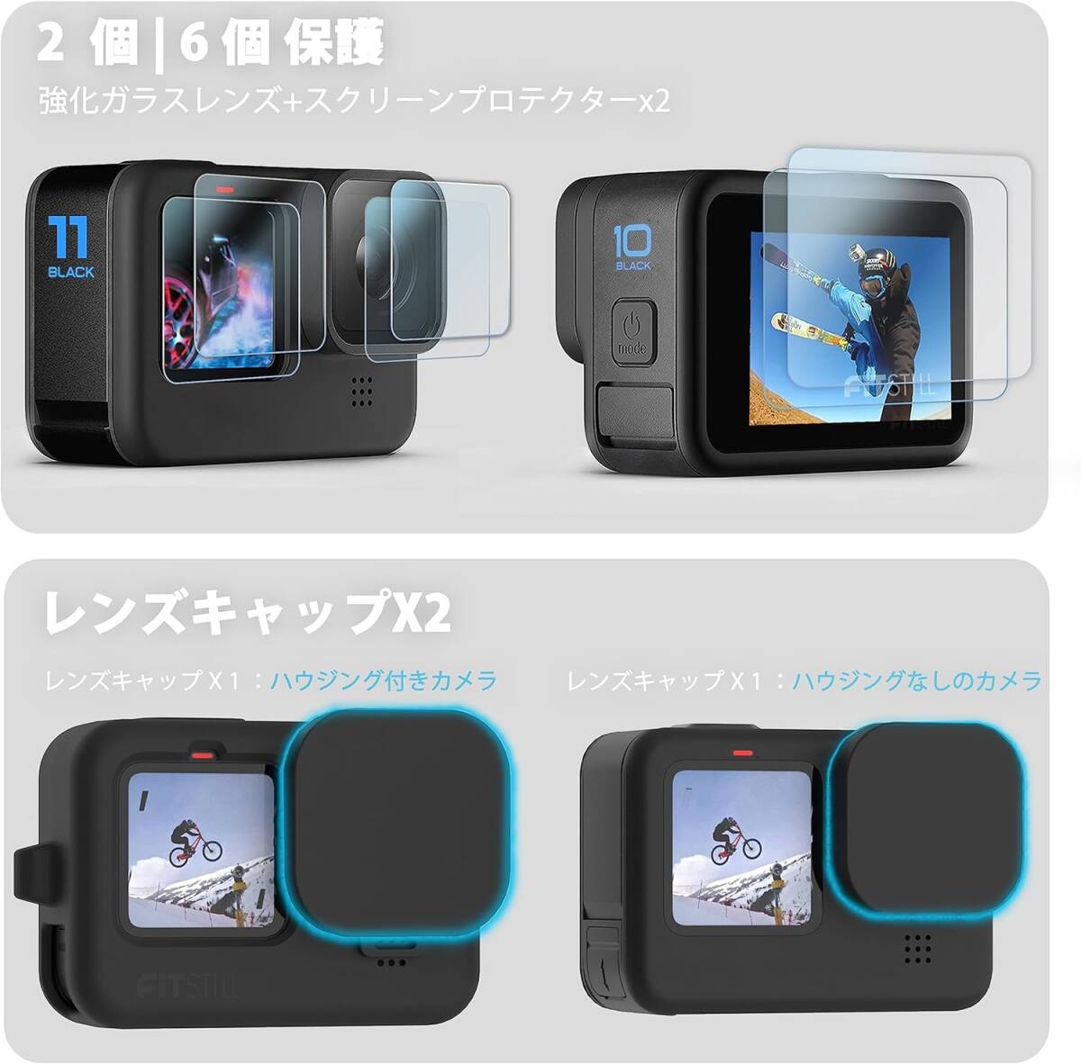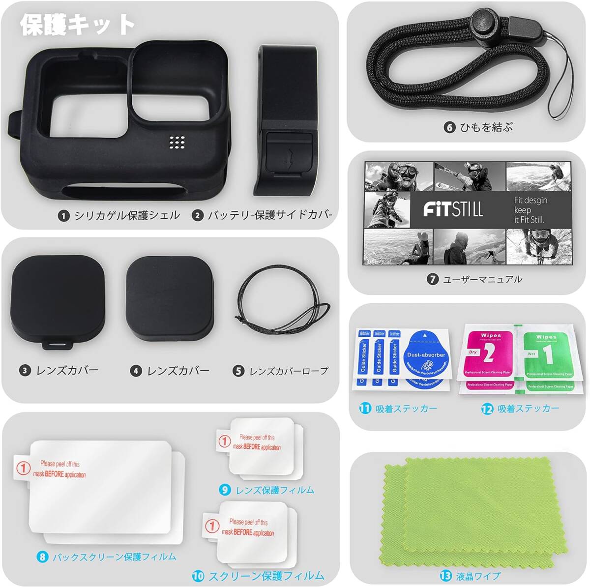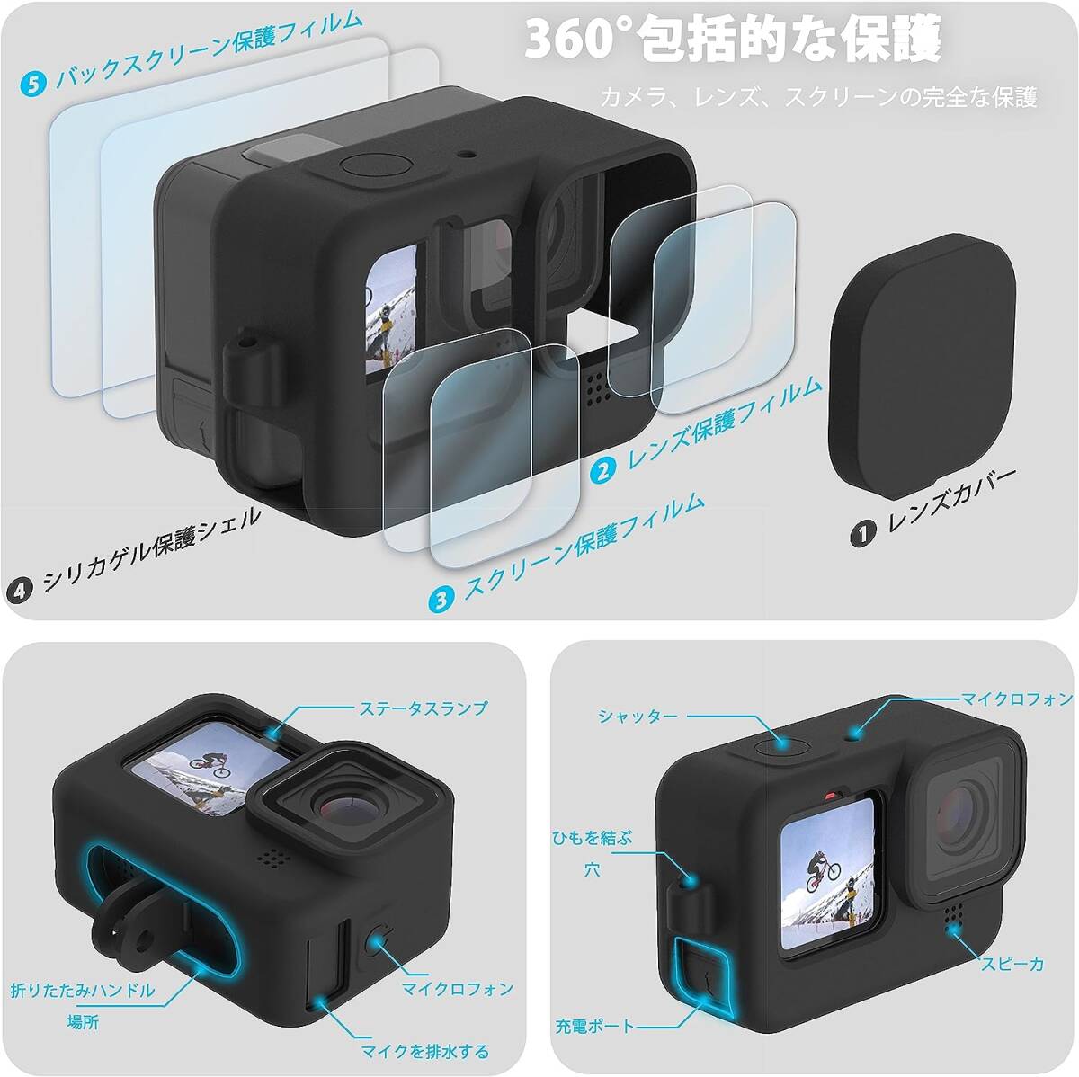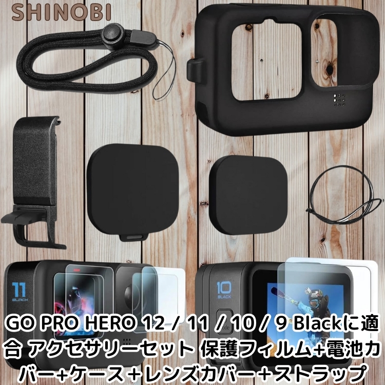 保護フィルム、電池カバー、ブラックシリコンケース、レンズカバー、ハンドストラップを含み、GoPro HERO 12、11、10、9 Blackに対応します。