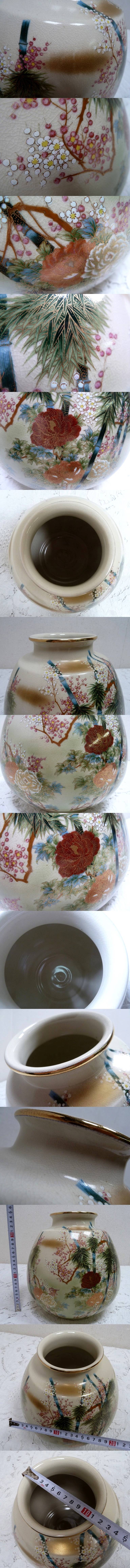 (☆BM)[大処分セール]九谷 陶栄 花瓶 菊/竹/梅/椿/牡丹/花紋 色絵 華道具 花器 壺 高さ25.5㎝ 九谷焼 クラッシックレトロ 華道具