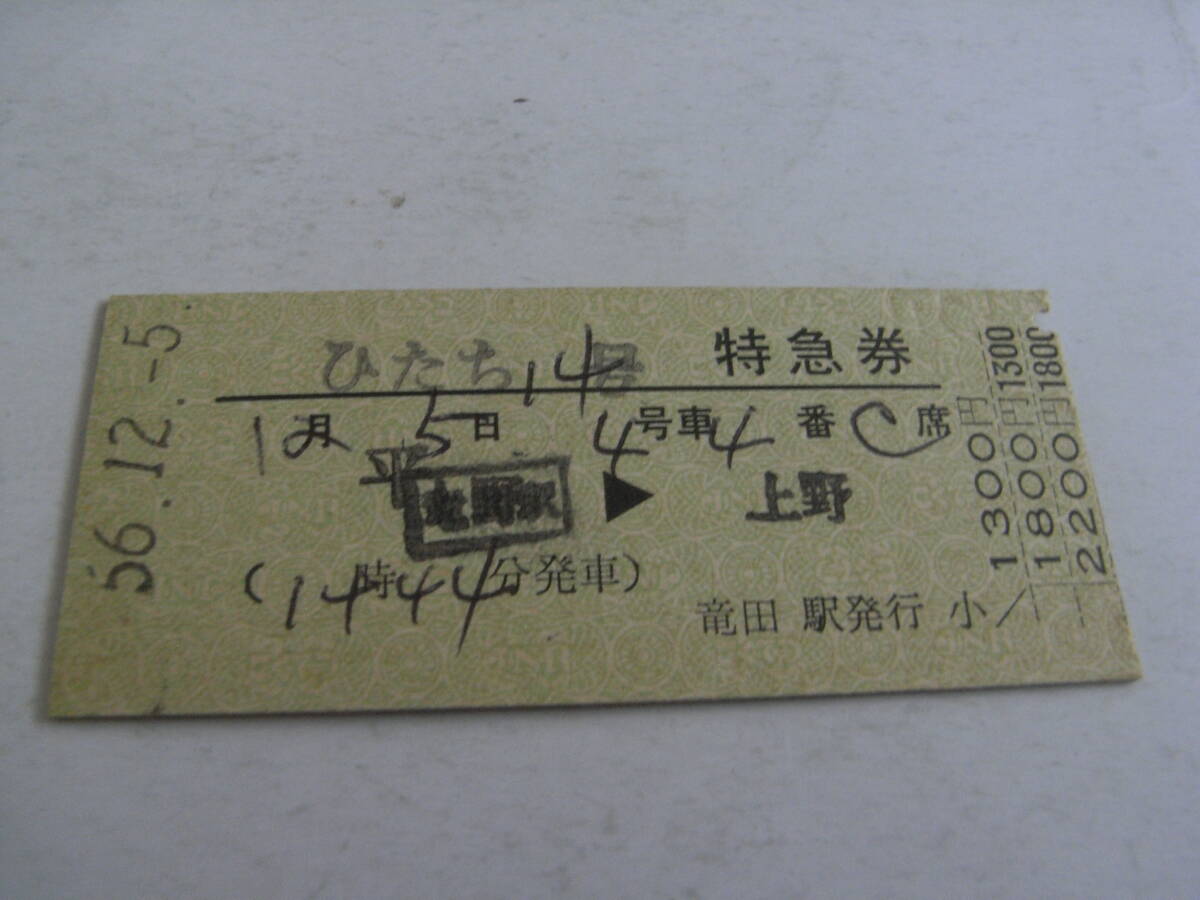 ひたち14号 特急券 平→上野 昭和56年12月5日発行 (常磐線)竜田駅発行