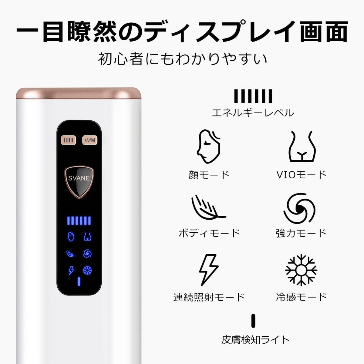 出力設定: SVANE脱毛器は肌質や使用部位にあわせて4つの照射モードを設置して、光の強さを6段階を自由に調節可能です。さらに連発モードも選択可能。