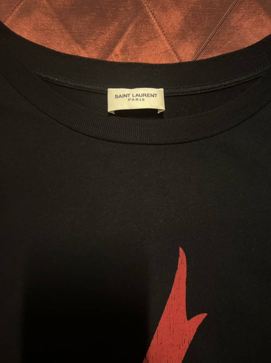 SAINT LAURENT PARIS サンローラン パリ     Tシャツ      サイズ XS       デザイン 正面は黒に赤の炎の柄、背面はブラックの無地             寸法、肩幅、約44cm、脇下身幅、約49cm、着丈、約65cm。   素人採寸のため誤差はご容赦願います。           背面、下部に数か所ごく小さな穴空きが見受けられます。白いパンツを履いたときは着用時多少穴空きがわかるかもしれませんが、黒や暗めの色のパンツを履いた場合は着用時まったく目立たないようです。予めご了承願います。               付属品はありません。            レターパックライトで発送いたします。
