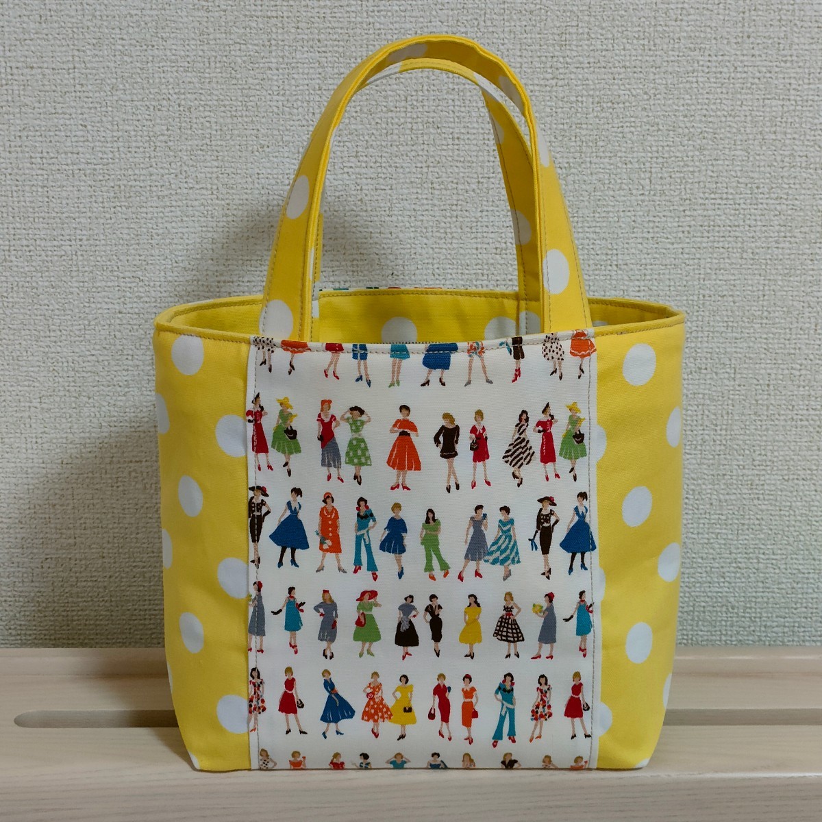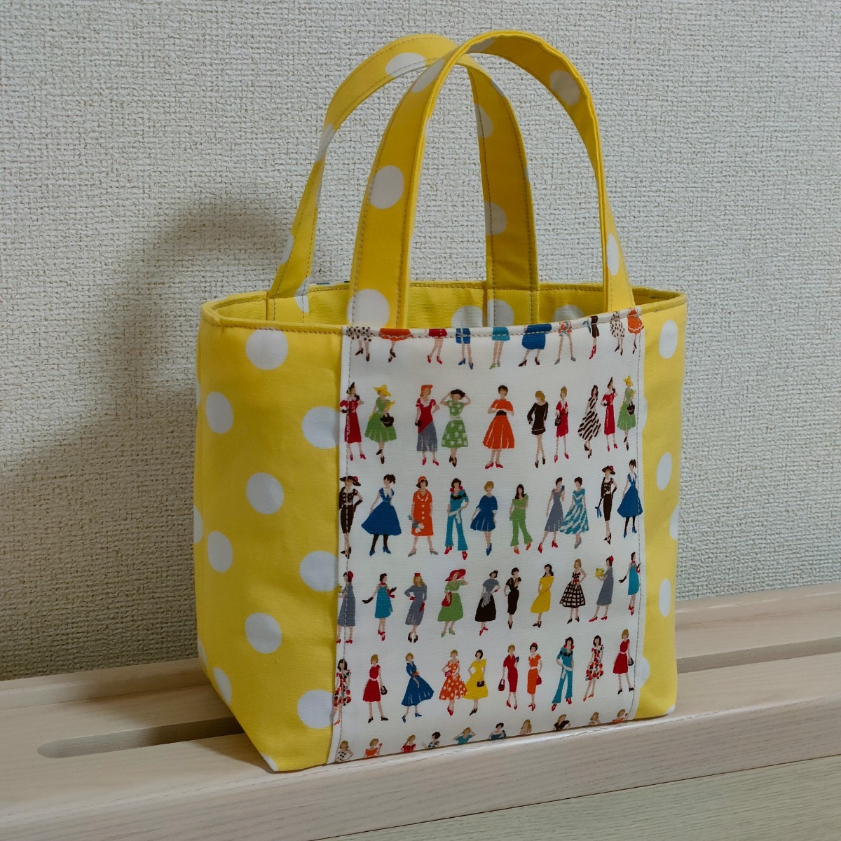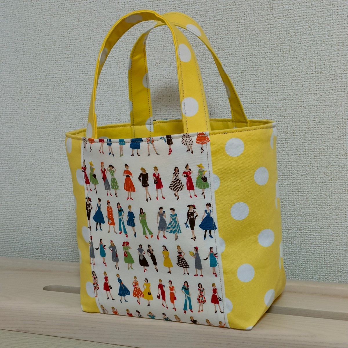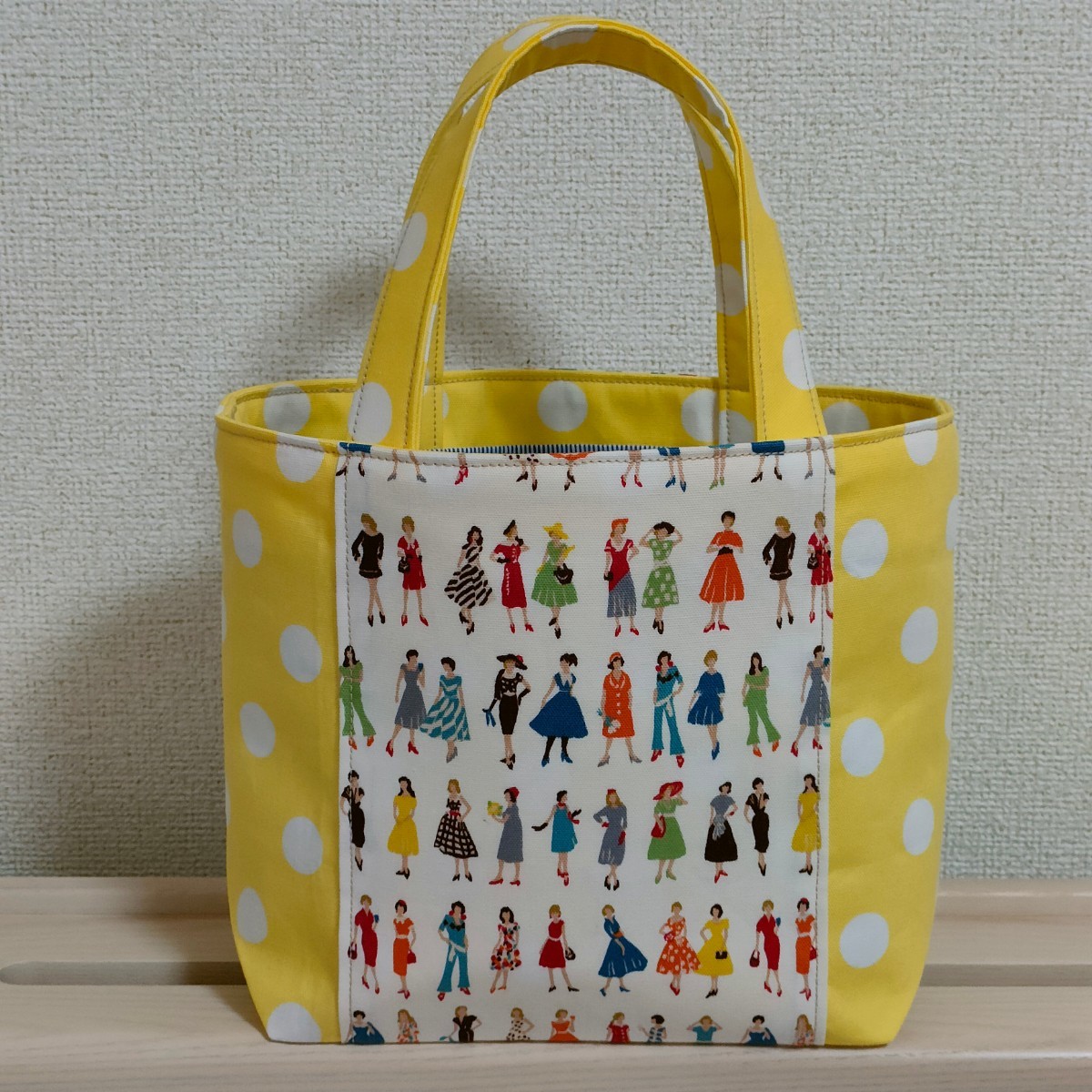 オシャレな洋服を着飾った女性と水玉模様が可愛い生地のミニトートバッグはいかがでしょうか♪