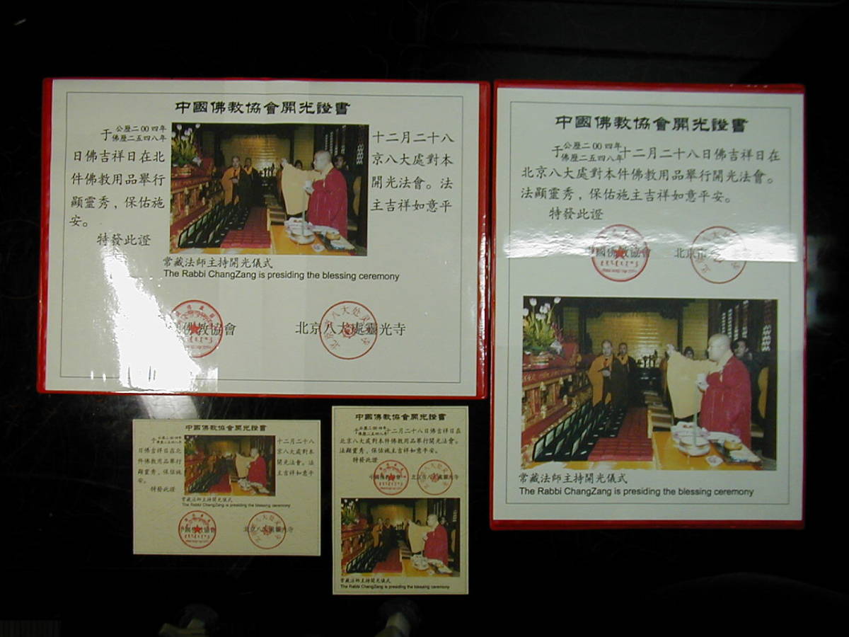 最後の9、10枚のの写真をご覧ください。本品にお付けする開光証書は、中国佛教協会と北京八大処霊光寺により発行されたものです。写真右側の大きい開光証書は、正式の原本です。(1,600件の開光品に対してたった一つの証書が発行されたのみです。小さい正式開光証書は、中国佛教協会と北京八大処霊光寺により発行された本品のための正式開光証書です。)