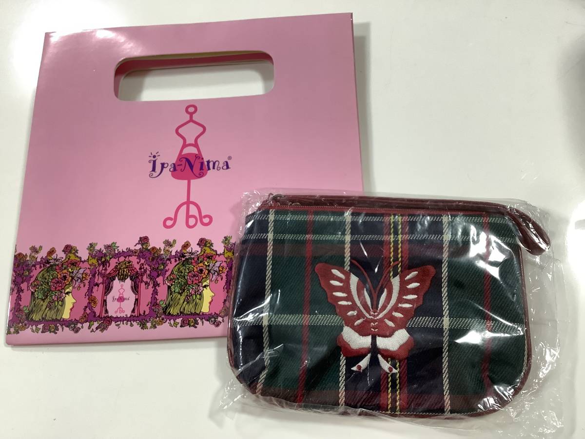 新品【送料込み】IPA-Nima イパニマ ポーチ ショップ袋付き ★チェック 刺繍 蝶々 バタフライ ★ベトナム