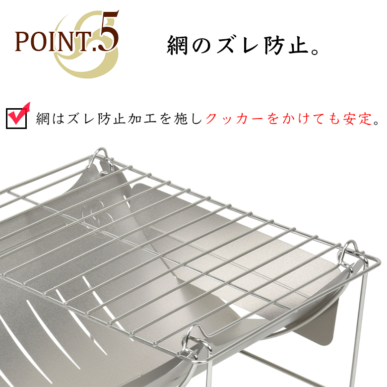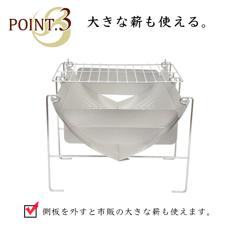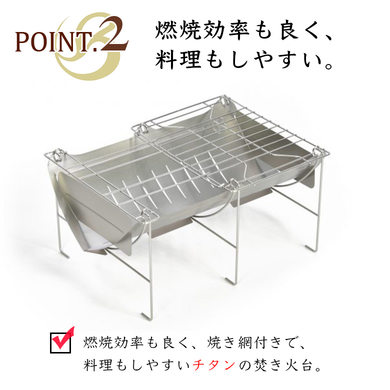 ・軽量コンパクトながら側板を外せば大きな薪も使える。燃焼効率も良く焼き網付きで料理もしやすいチタンの焚き火台。