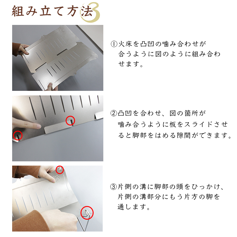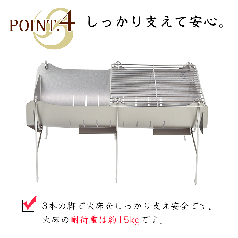 ・3本の脚で火床をしっかり支え安全です。火床の耐荷重は約15kgです。