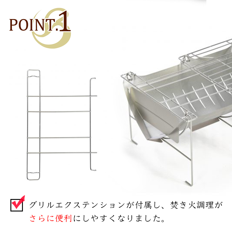 グリルエクステンションが付属し、焚き火調理がさらに便利にしやすくなりました。