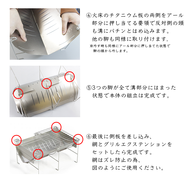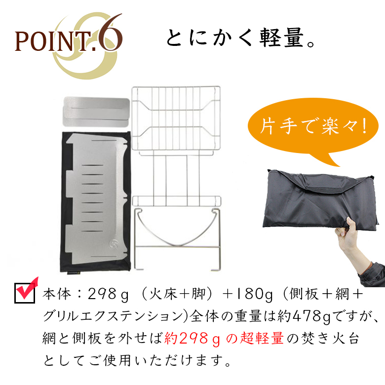 ・本体:298g(火床+脚)+180g(側板+網+グリルエクステンション)