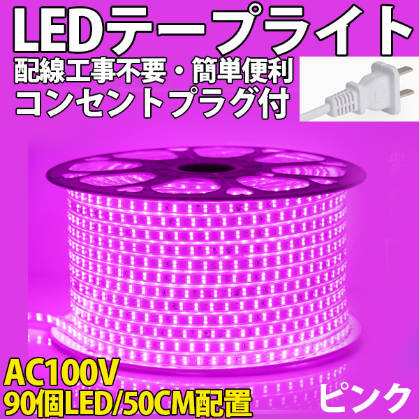 送料無料 LEDテープライトPSE コンセントプラグ付き AC100V 50cm 90SMD 配線工事不要 簡単便利 ピンク 間接照明 棚照明 二列式