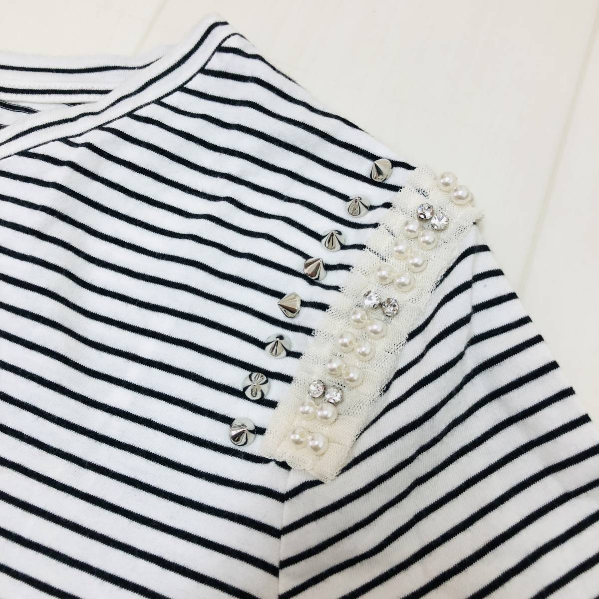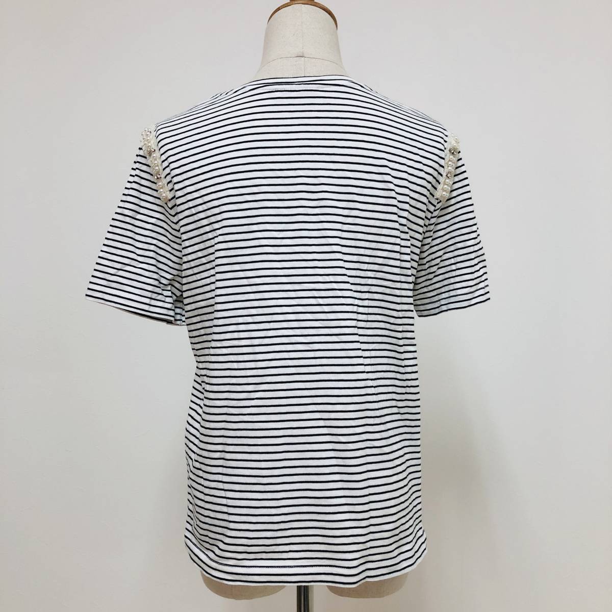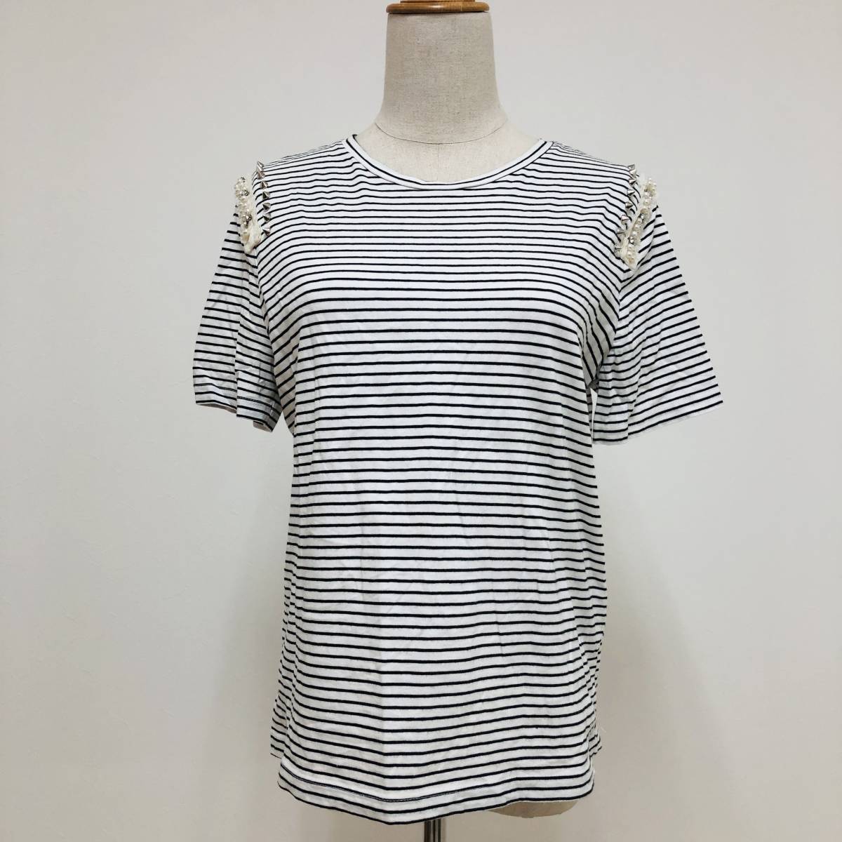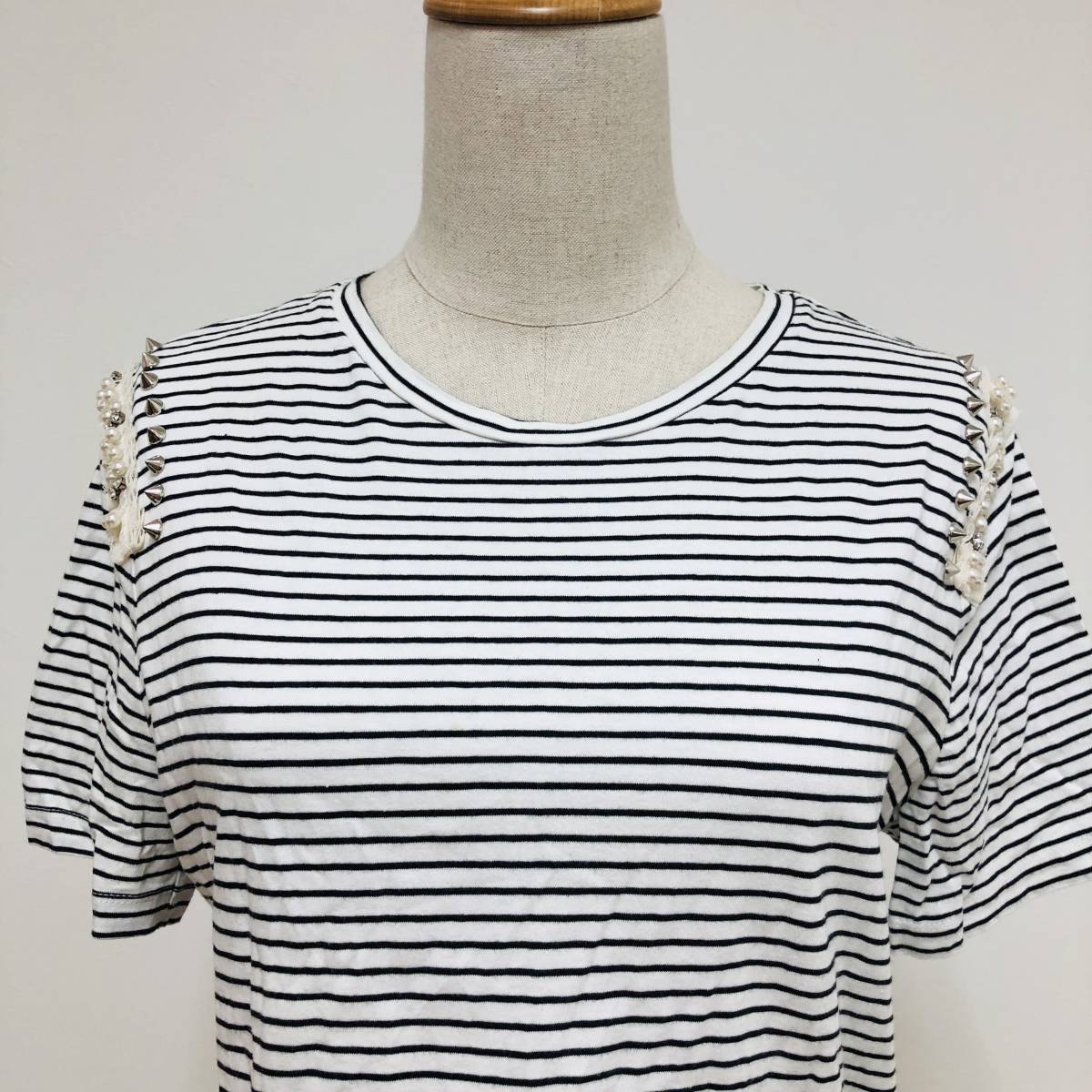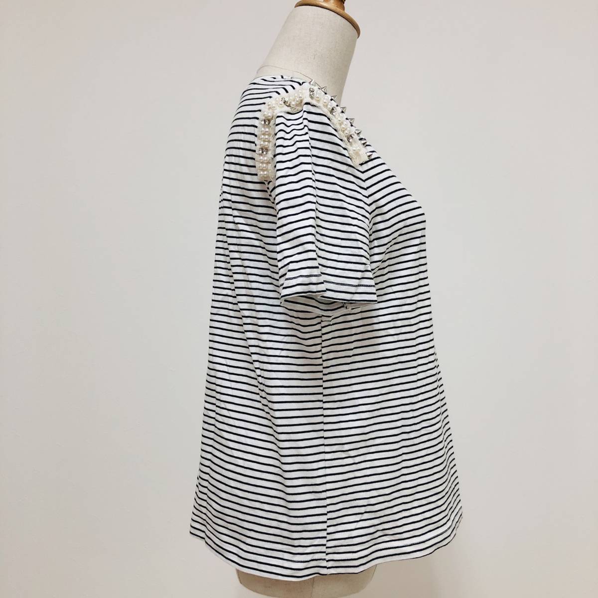 k0908 美品 ZARA ザラ Tシャツ コットン混 スタッズ ビジュー 薄手 丸首 夏 M 白 黒 ボーダー レディース 万能 シンプルデイリーカジュアル