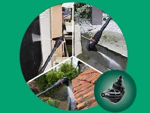 車の下や雨どい、2階の窓などの洗浄に活躍する「90度変換ノズル」