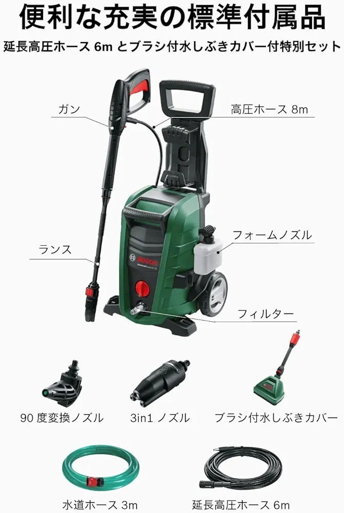ボッシュ(BOSCH)高圧洗浄機特別セット (6m延長高圧ホース・ブラシ付き水しぶきカバー特別付属)1500W 最大許容圧力12MPa パワフル洗浄 コンパクト収納 [8m高圧・3m水道ホース・車輪付き] UA125J3