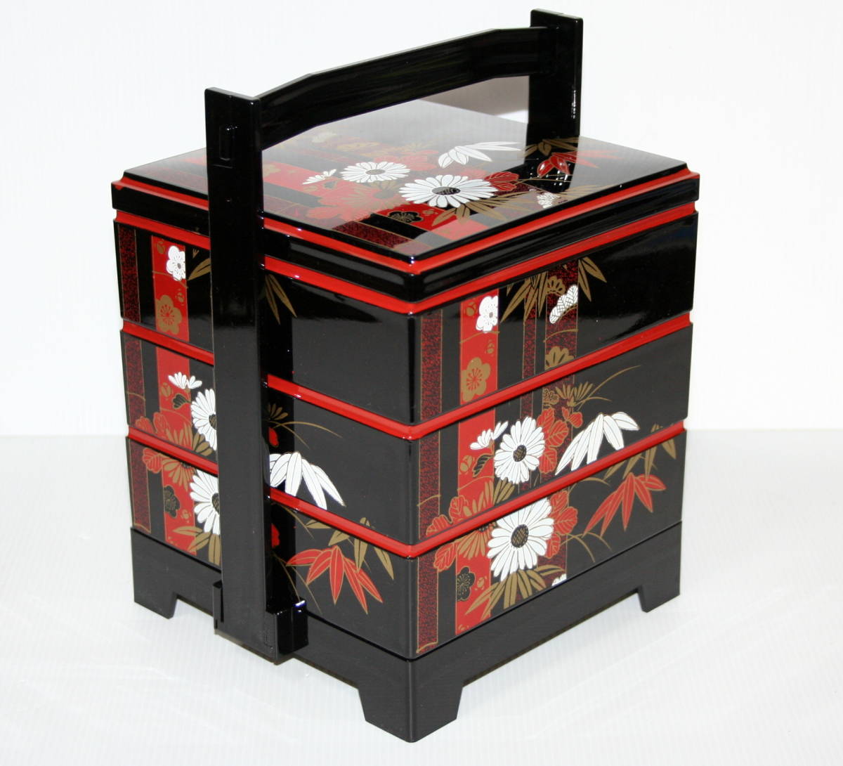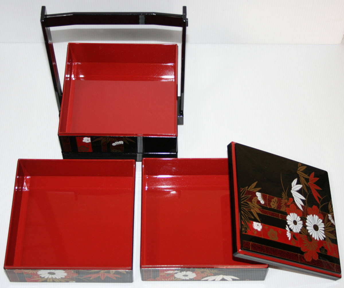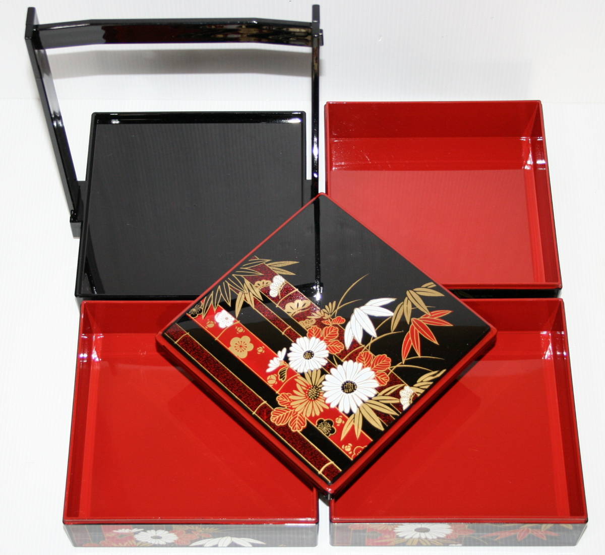 サイズ(約):重箱 16.5cm × 16.5cm、3段重箱高さ 19cm、取っ手までの高さ 24cm