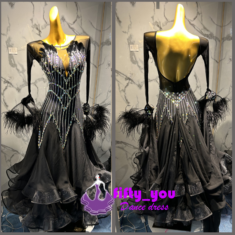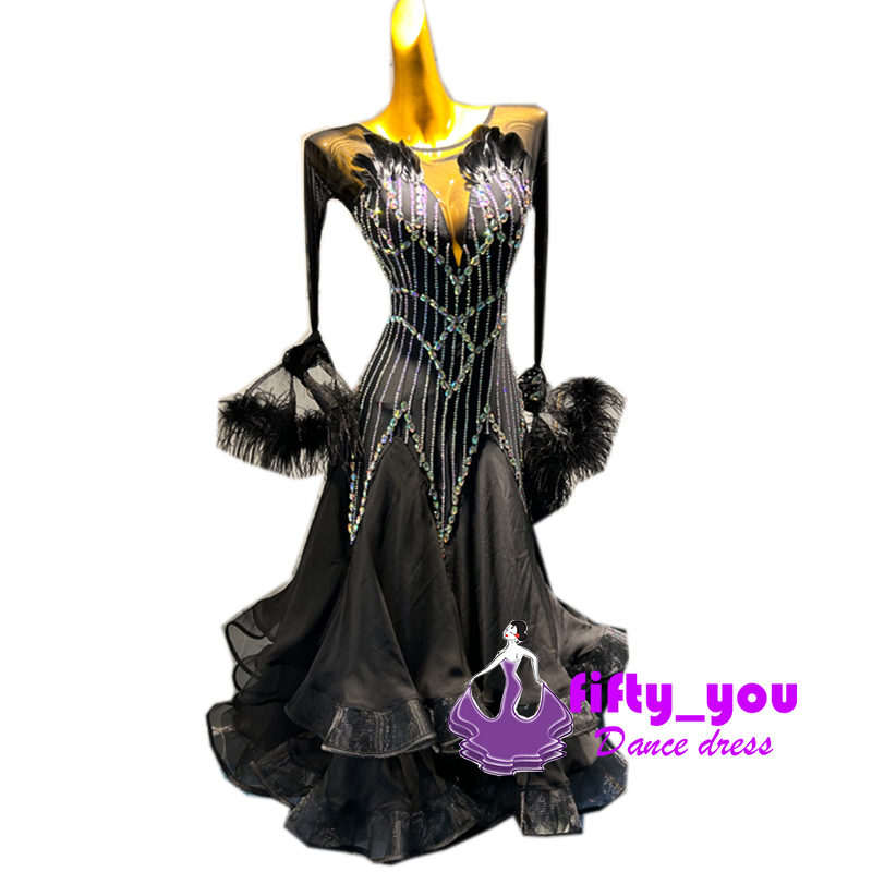 新品fifty_you高品質 モダンダンス競技豪華ドレス レディース社交ダンス衣装 サイズセミオーダー 華やかデザイン 羽飾り 黒色 エレガント