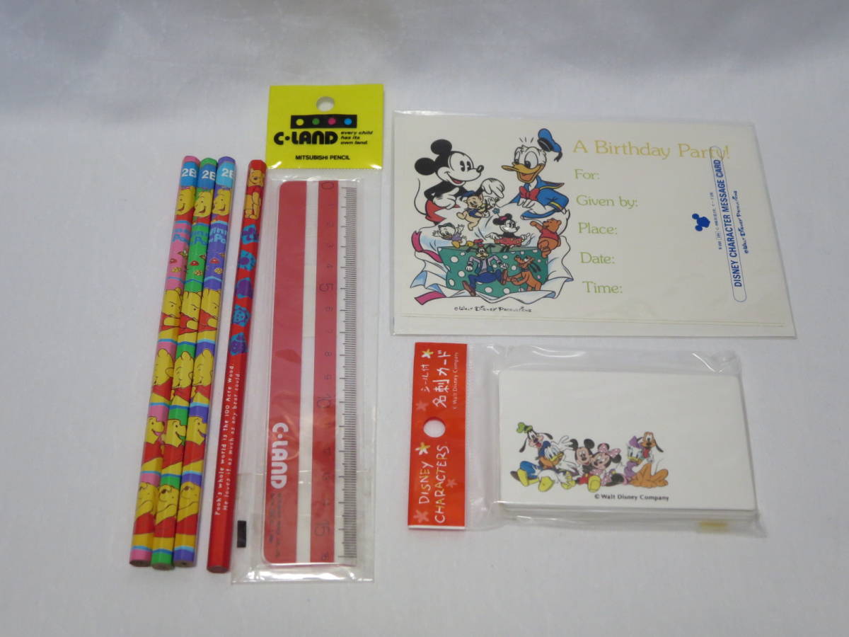 ●2B鉛筆(三菱)3本 ●赤鉛筆(サンスター) ●16cm定規(三菱) ●ディズニーキャラクターメッセージカード ●シール付き名刺カード(30枚・シール28個付1枚) 未使用で経年の自宅保管品です。 鉛筆(ピンク・グリーン)の上部の塗装が一部剥がれかけています。 御了解頂ける方からの、ご入札をお待ちしております。 |