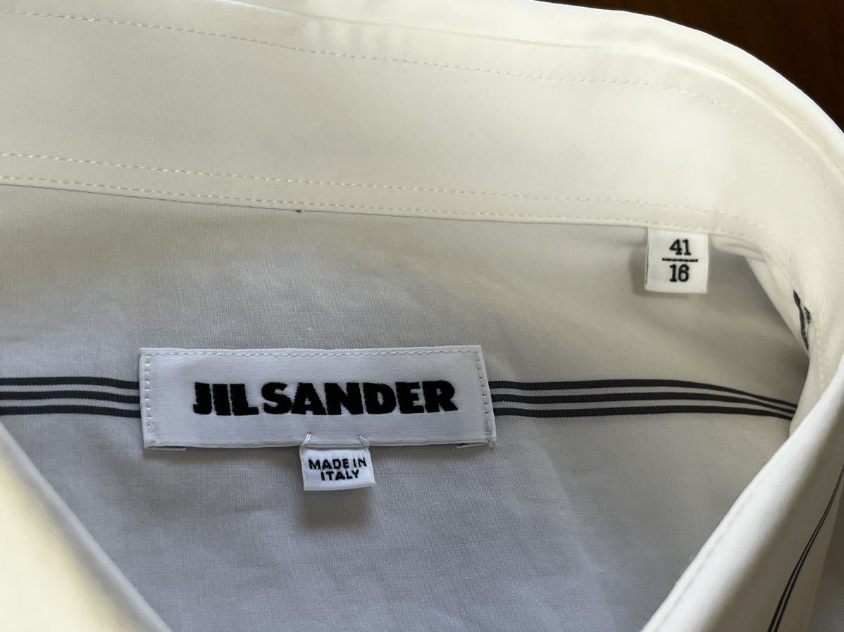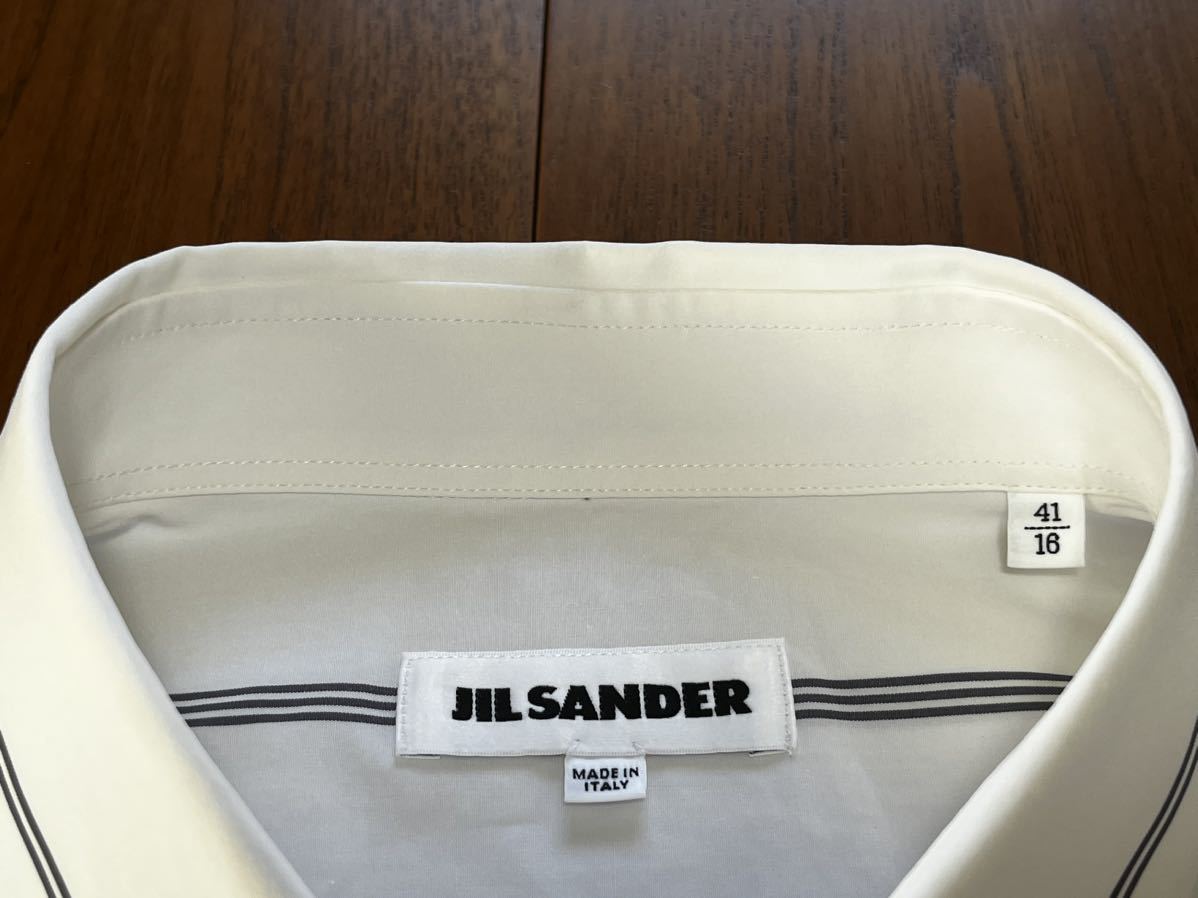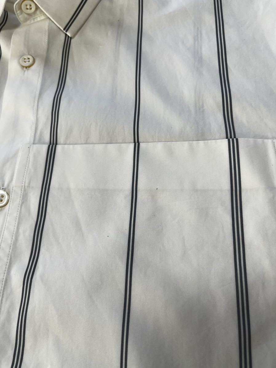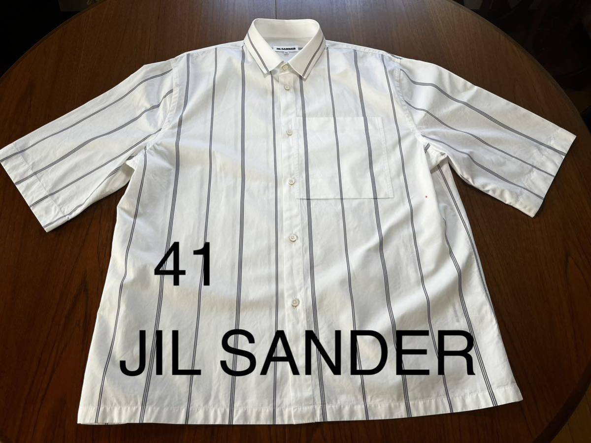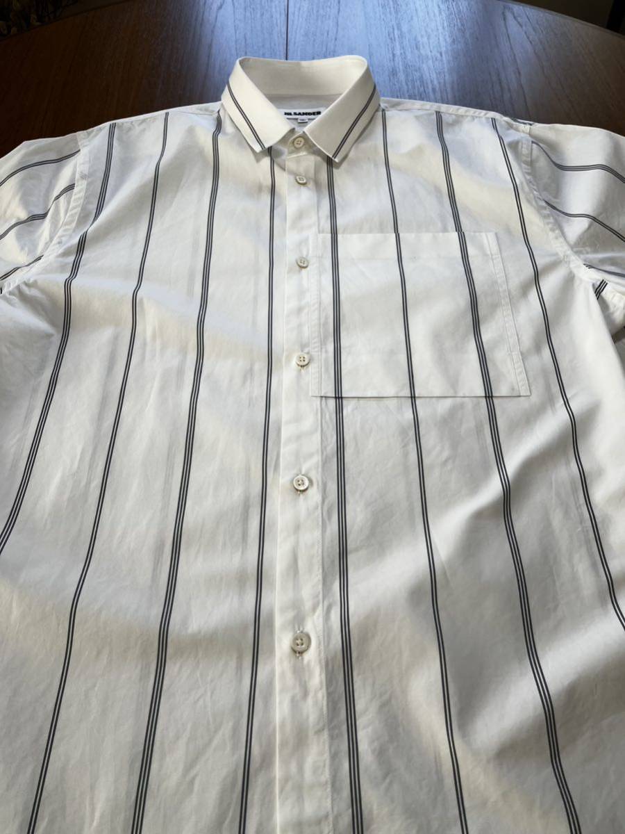 ジルサンダーの半袖シャツになります。ホワイトにグレーラインになります。サイズ41で肩幅50cm身幅62cm着丈74.5cm袖丈37cmになります。3回の着用で目立つ汚れ傷はありませんが、ポケット付近に画像9枚目の非常に小さな点の汚れ?があります。