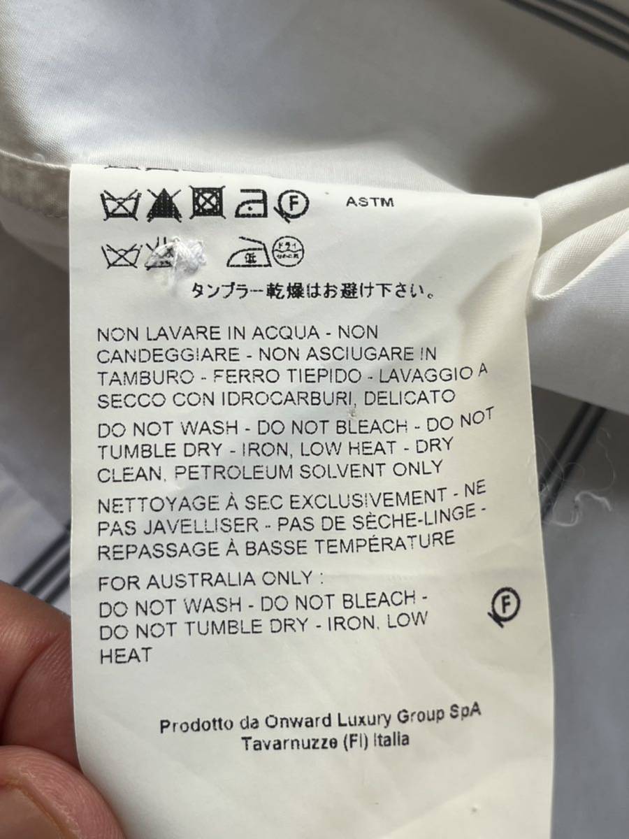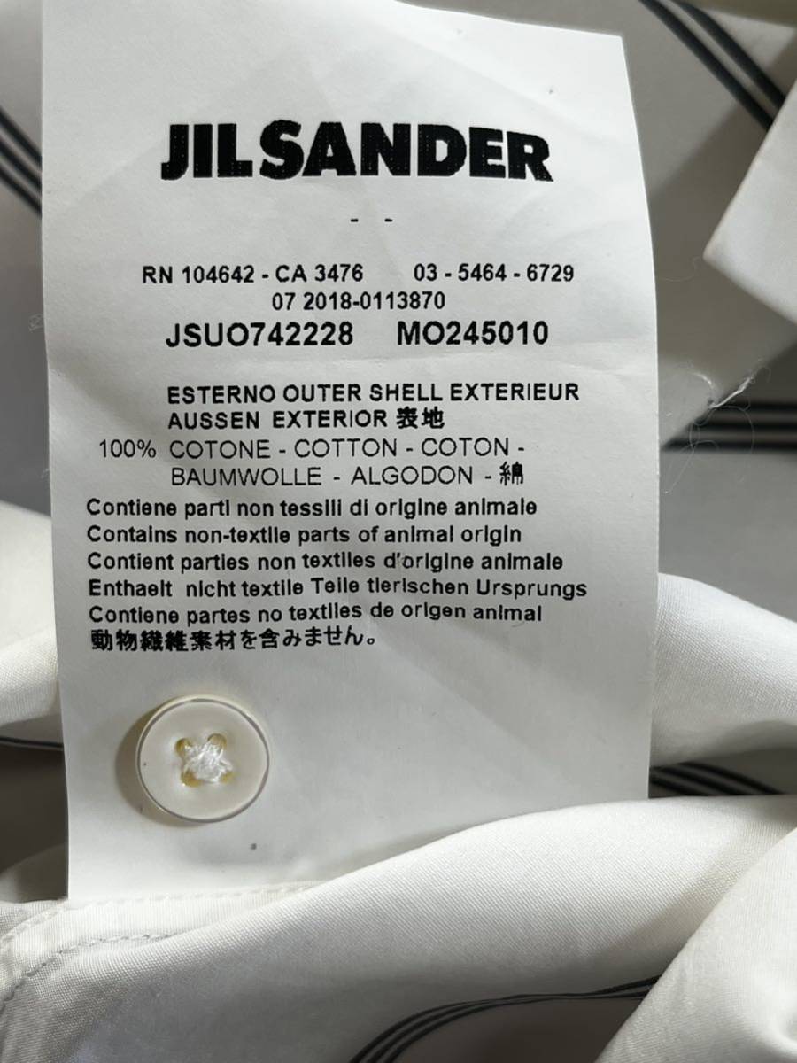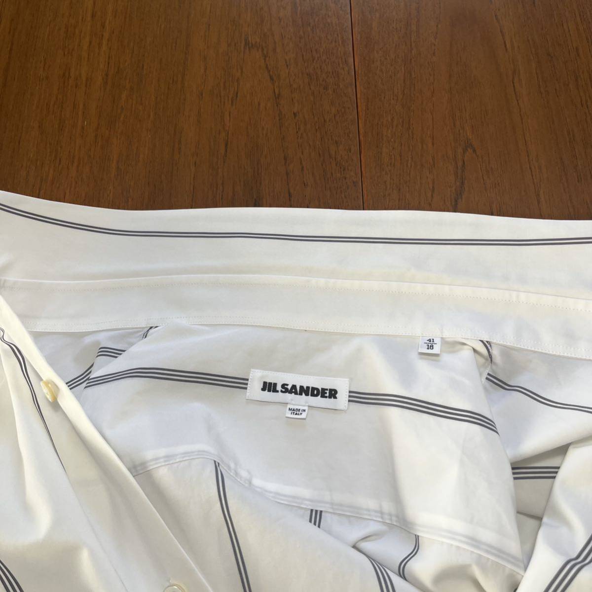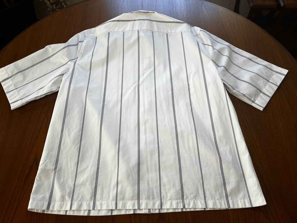 ジルサンダーの半袖シャツになります。ホワイトにグレーラインになります。サイズ41で肩幅50cm身幅62cm着丈74.5cm袖丈37cmになります。3回の着用で目立つ汚れ傷はありませんが、ポケット付近に画像9枚目の非常に小さな点の汚れ?があります。