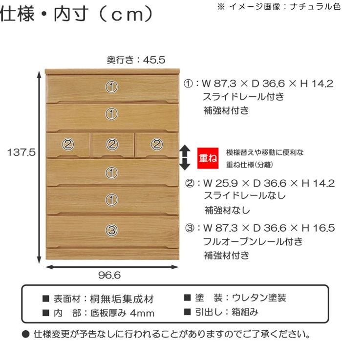 特  徴桐無垢集成材を使った、国産6段ハイチェスト。