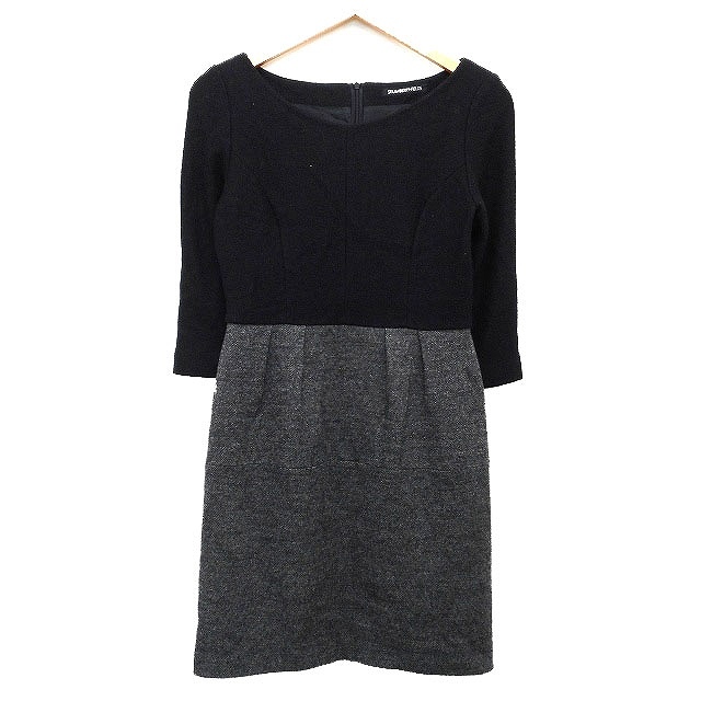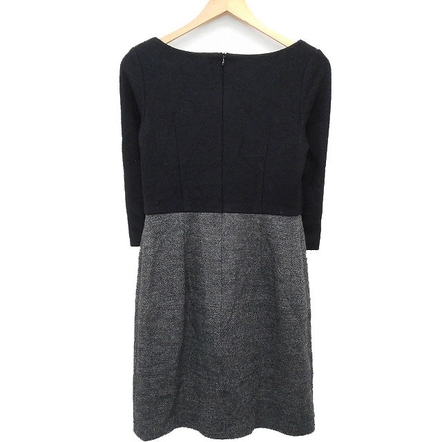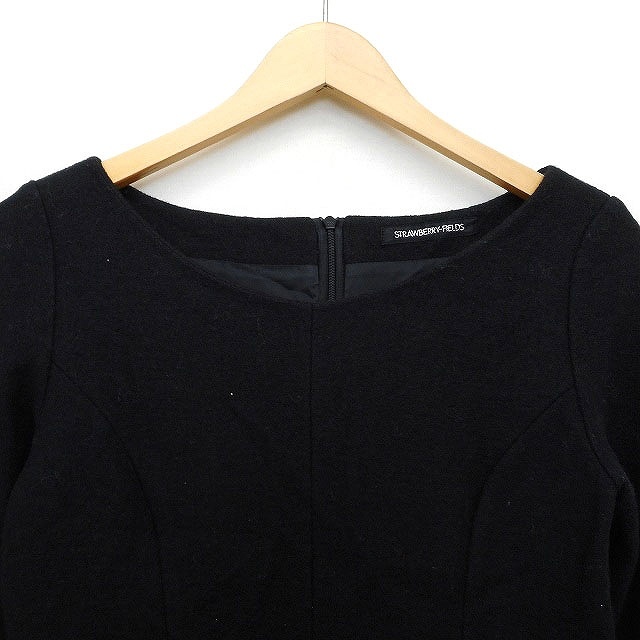 ストロベリーフィールズ STRAWBERRY-FIELDS ワンピース フレア 膝下 切替 メルトン ニット タック 七分袖 丸首 毛 黒 /HT21 レディース