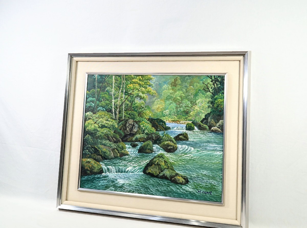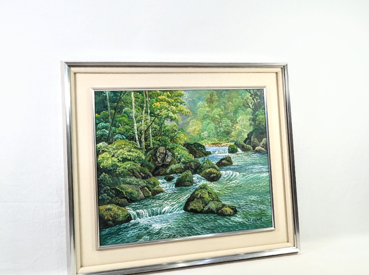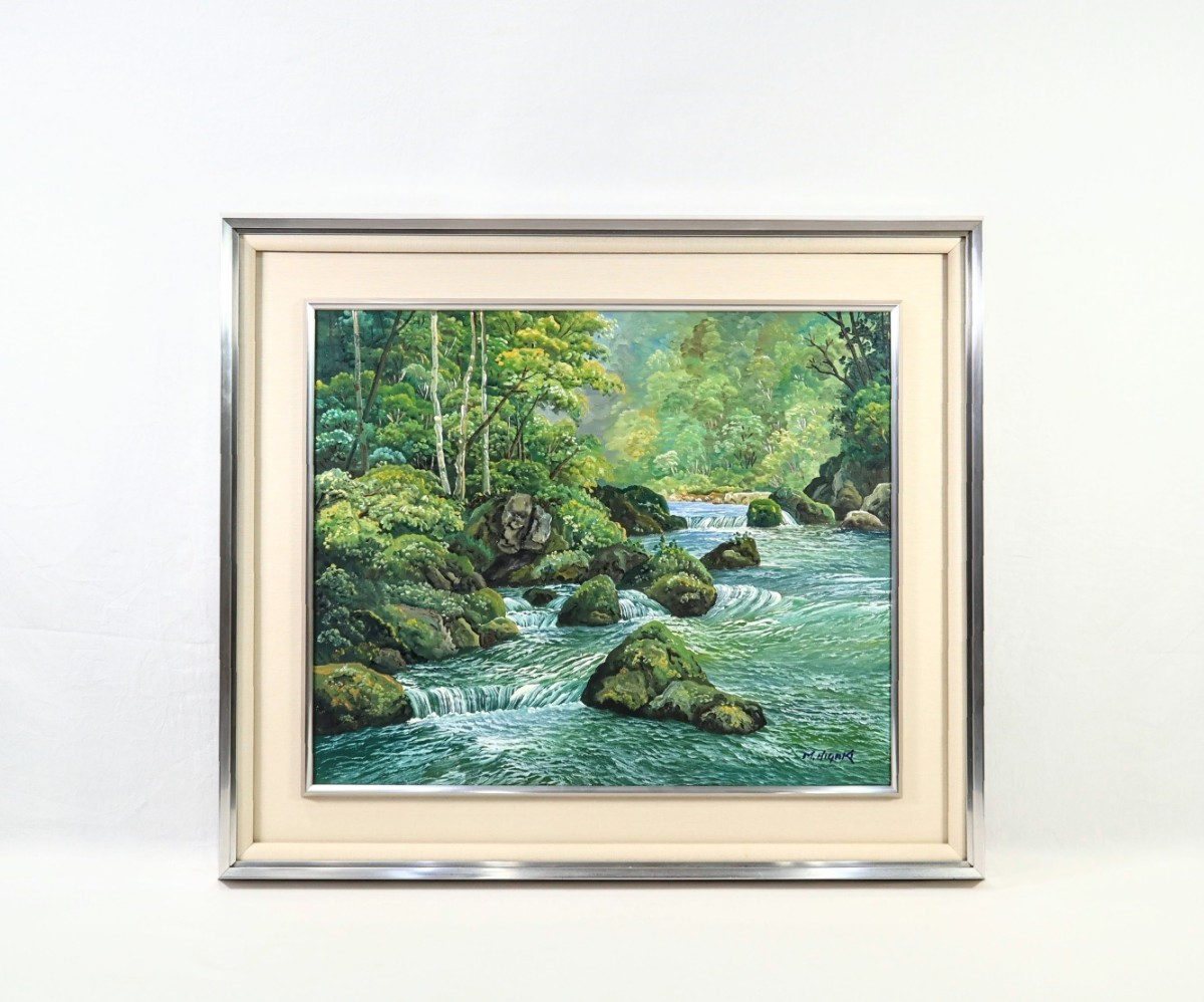 真作 日垣明貫 油彩「青森十和田奥入瀬渓谷」画寸 F12 大阪府出身 大翔会関西支部員 新緑樹林の渓谷と流れ勢い臨場感ある奥入瀬川 8035