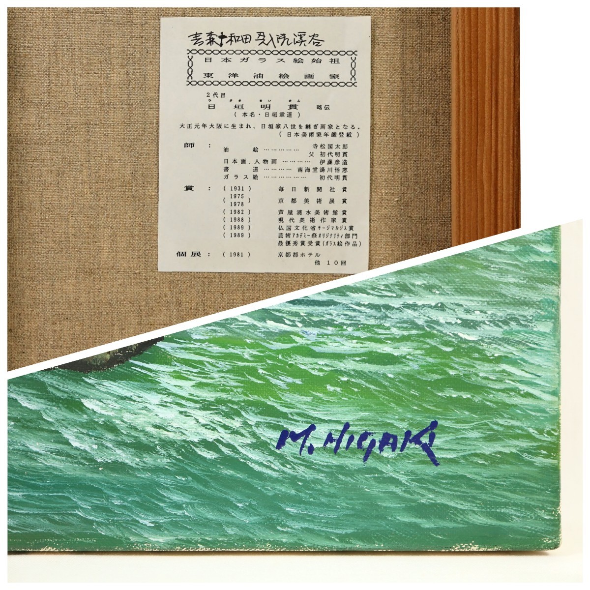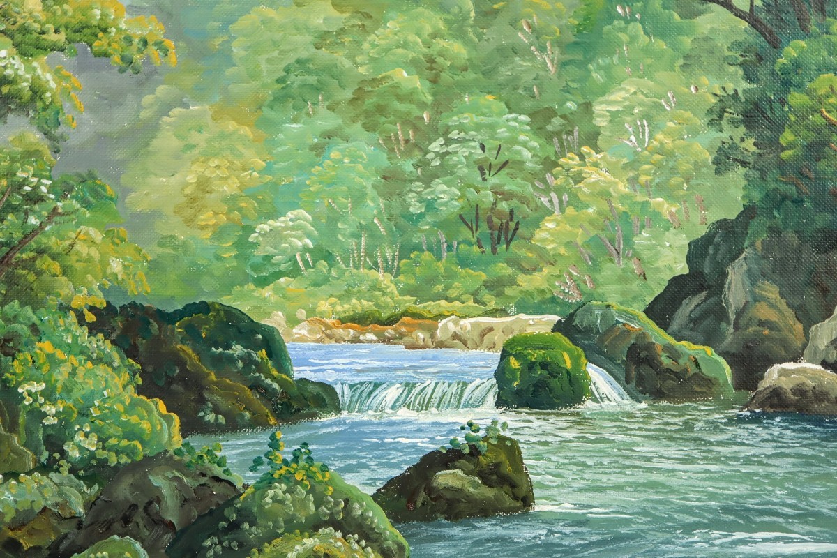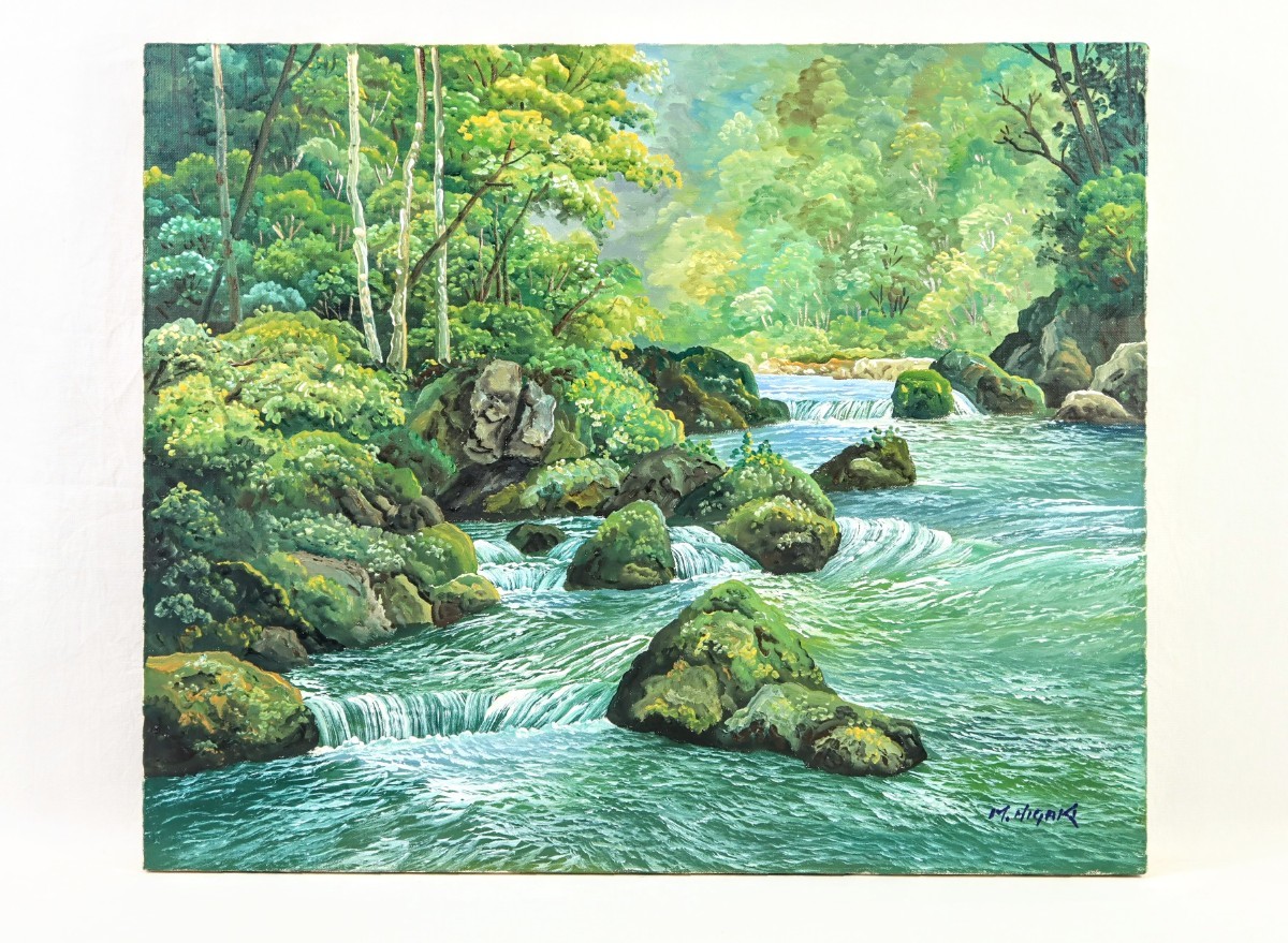 真作 日垣明貫 油彩「青森十和田奥入瀬渓谷」画寸 F12 大阪府出身 大翔会関西支部員 新緑樹林の渓谷と流れ勢い臨場感ある奥入瀬川 8035