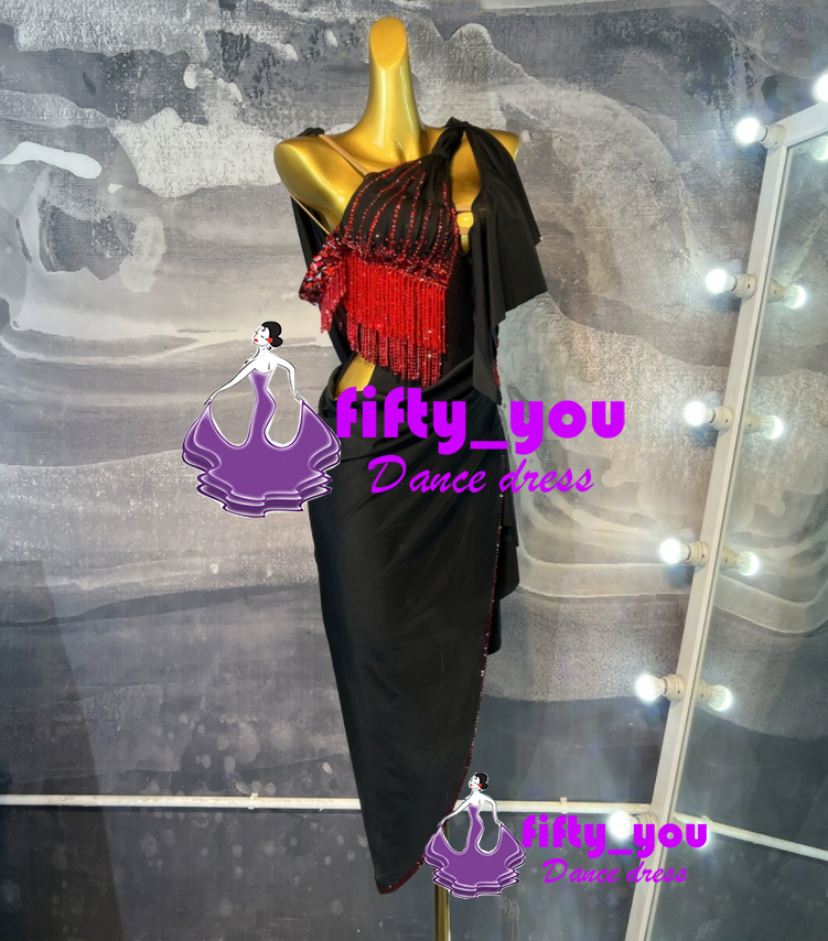 fifty_you レディース社交ダンス衣装 サイズセミオーダー  ビーズ飾り  ラテンドレス 競技試合ドレス  高級品 ブラック ロング
