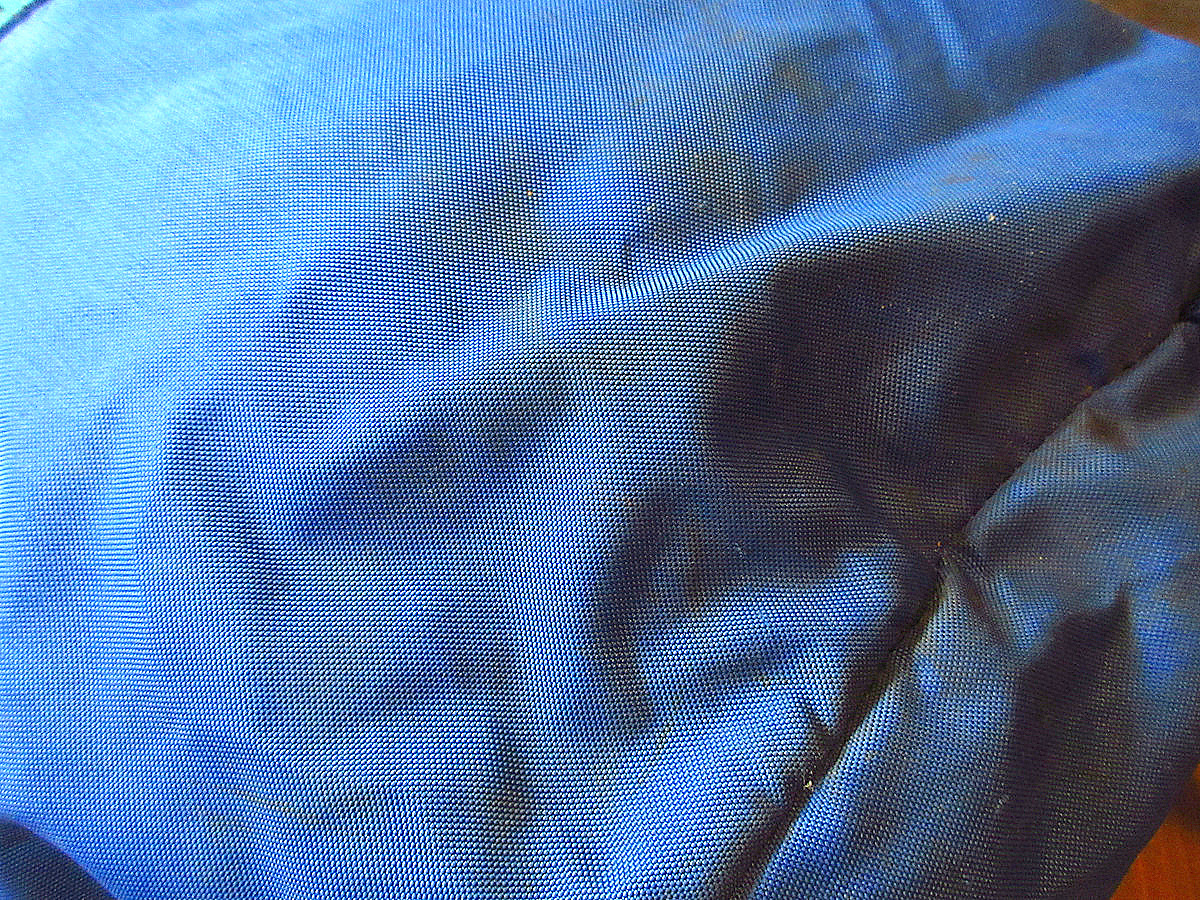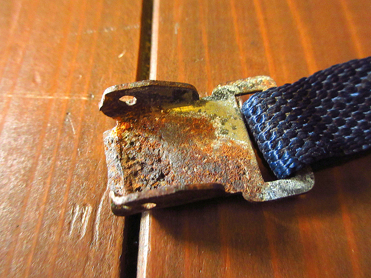 全体的にシミや汚れ多数あり、ナイロン特有の匂いあり、全ての金具に錆やダメージがありサイズ調整、ポケットのジッパーの開閉ができません。