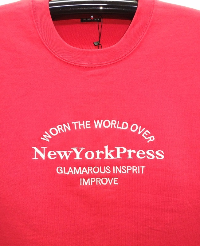 NEWYORKPRESSの別注品トレーナーです。 1001-2新品 赤 綿:100% S寸実寸です。着丈:61cm 肩幅:46cm 胸幅:53cm 袖丈:58cm当店の別注品、綿100%のトレーナーです。前に大きな刺繍入りです。裏毛生地です!裏起毛ではありません!定価¥5900+税=¥6490です。水曜日は定休日ですので、連絡、発送等の取引業務は 出来ませんのでよろしくお願い致します。 定休日以外連絡可能な時間は、11時~18時迄です。