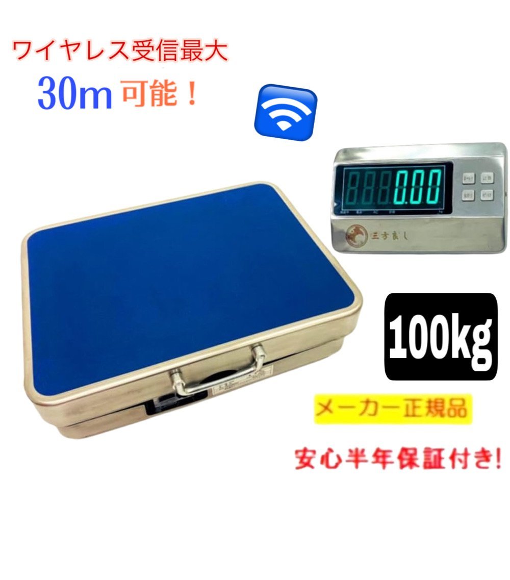 安心半年保証付!<br>ワイヤレス式デジタル台はかり,モニター置く場所を自由に!専用バック掛ける可能,面倒な組立必要なし!<br>ステンレス製台面!持ち運び便利な取手付!<br> 最大測定可能重量100kg 最小測定可能重量0.2kg <br>  表示:LED表示(検定なし 注:正式な売買ご利用できません。 )<br>風袋引き:フルスケール<br> 台の大きさ:(約)32cm×42cmcm <br>重さ:約7kg  <br>電源:充電式<br>(AC100V 50/60Hz) バッテリー連続使用時間 48時間(フル充電時)<br> 作動温度:-10℃~+40℃ <br>リチャージャブルバッテリー:4V/4Ah<br> モニターと台面最大受信距離:直線約30mです。<br>注:本体防水ではありません。<br> 注意事項: ご利用する前に、本体台面の電源スイッチとモニター電源スイッチを入れる順番は必ず守ってください。<br> 電源オン:1.まず最初に台面の電源スイッチを入れてから、2.次にモニター電源スイッチを入れます。  電源オフ:1.先にモニター電源スイッチをオフしてから、2.次に台面の電源スイッチをオフします。 モニターと台面最大受信距離:直線距離約30mです,モニターと台面の間に障害物を置かないでください。 <br>