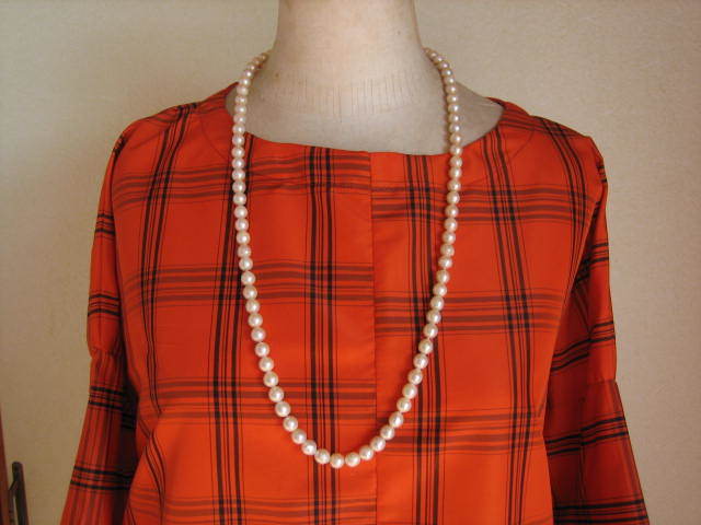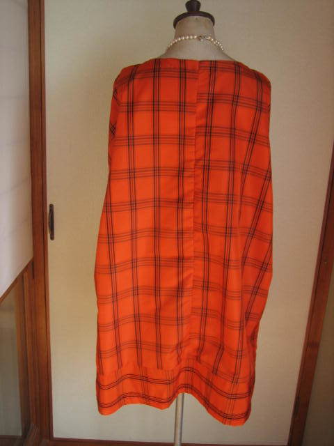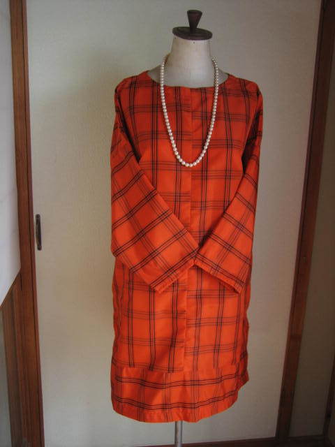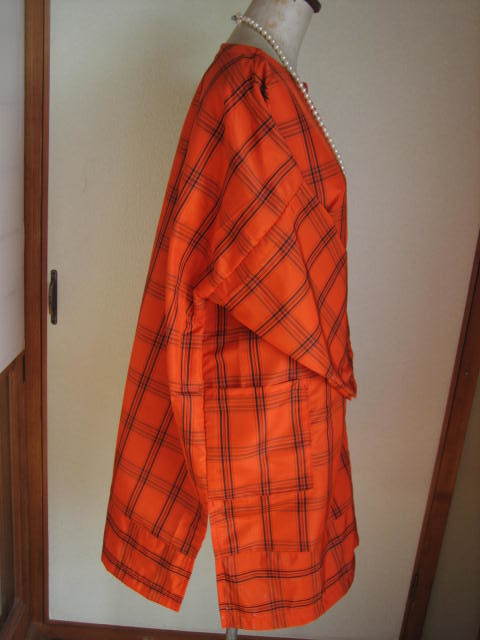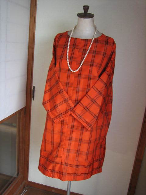 130 着物リメイク 大島紬 赤色 格子模様 チュニックワンピース。ゆったりサイズ