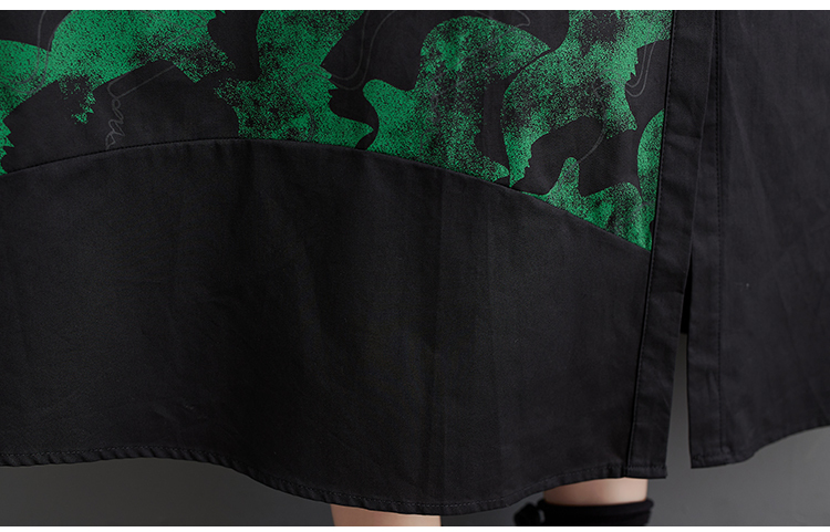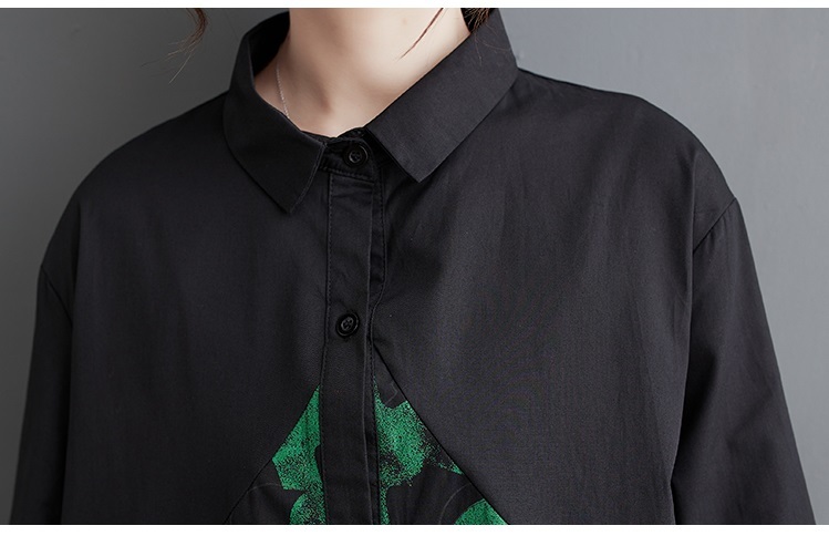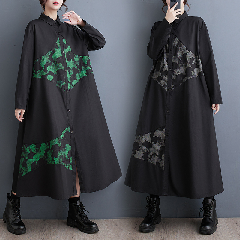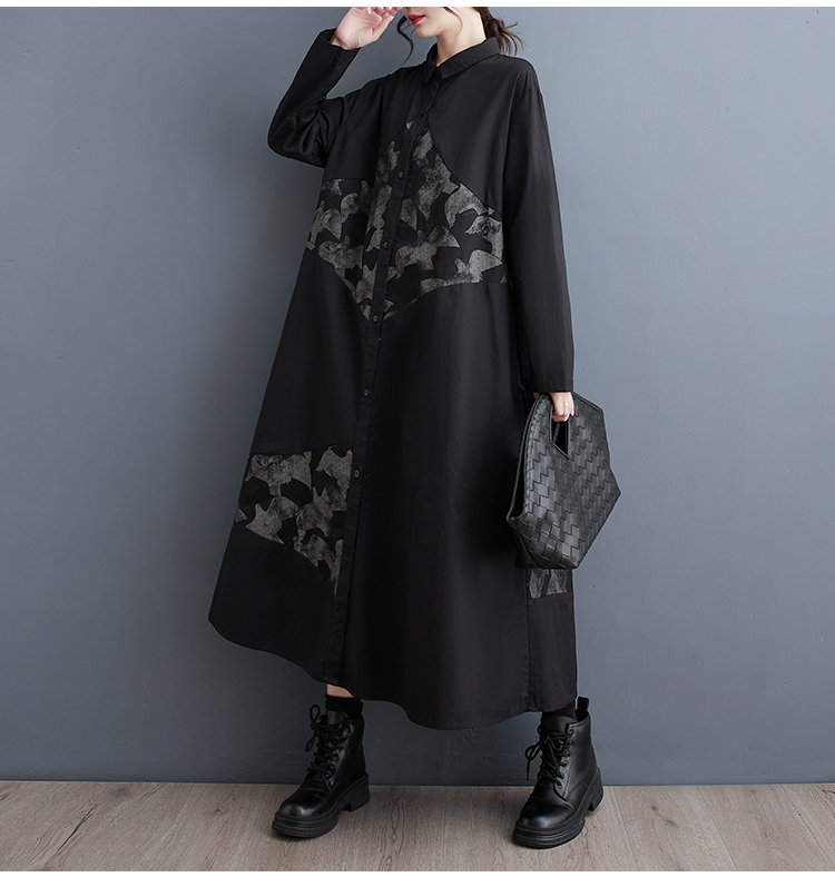 「同梱1万円送料無料」秋*新作*カジュアル*ゆったり大きいサイズ*体型カバー*配色*プリント柄*長袖*ロングシャツワンピース*F*黒