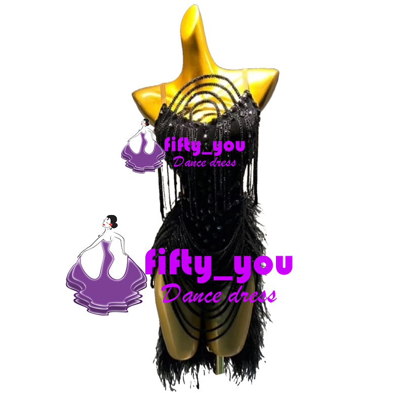 新品fifty_you レディース社交ダンスドレス  魅力サイズセミオーダー 競技ドレス お洒落パーティードレス 羽スカート ラテンドレス 黒