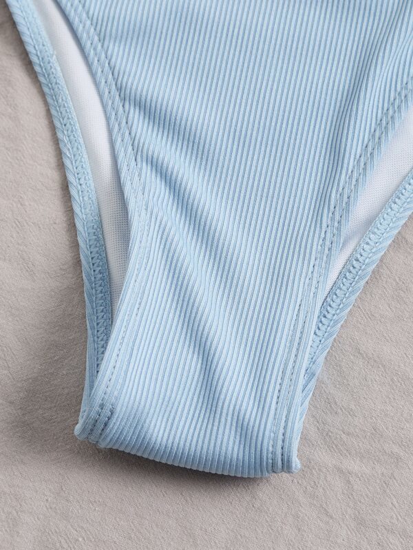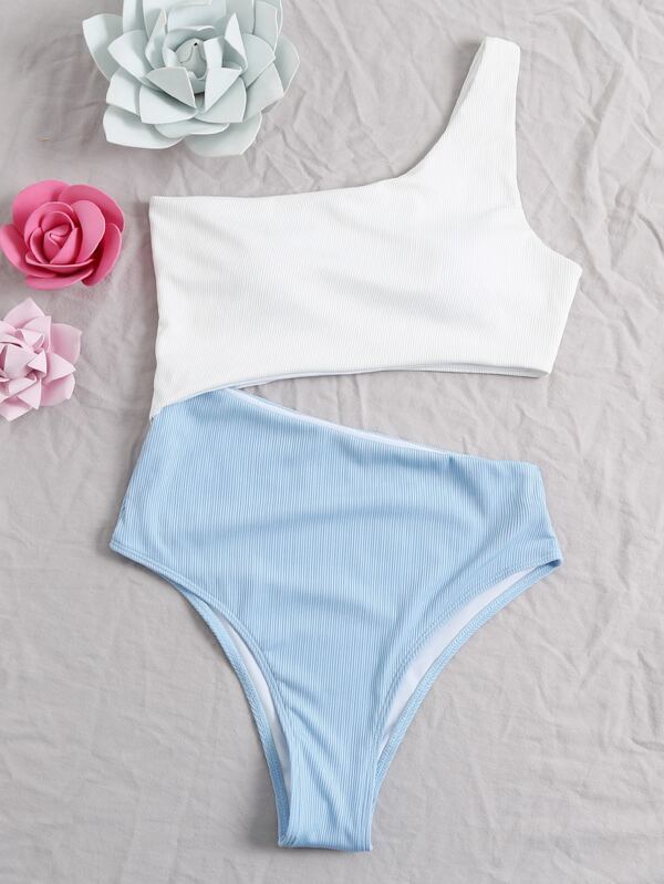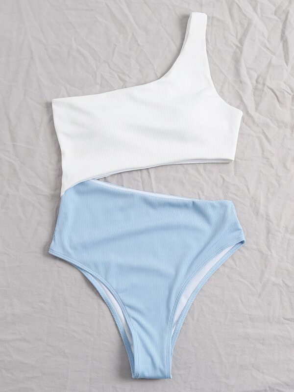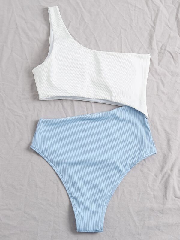 レディース 水着 ワンピース ツートーン リブ カットアウト ワンショルダー ワンピース水着