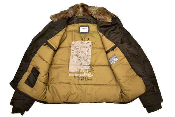 ブラウンカラー 外ポケット三個 内ポケット三個 首元ファー付き(取り外し可能) 内側プリントあり フルジップアップ ダウンジャケット