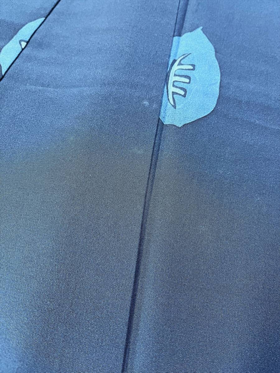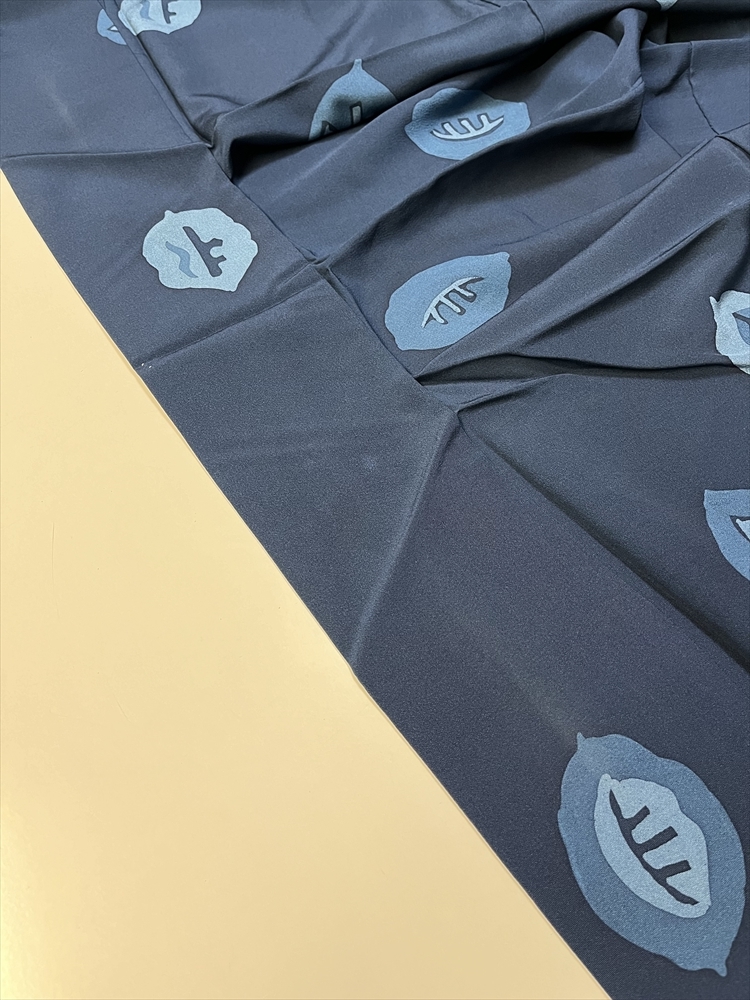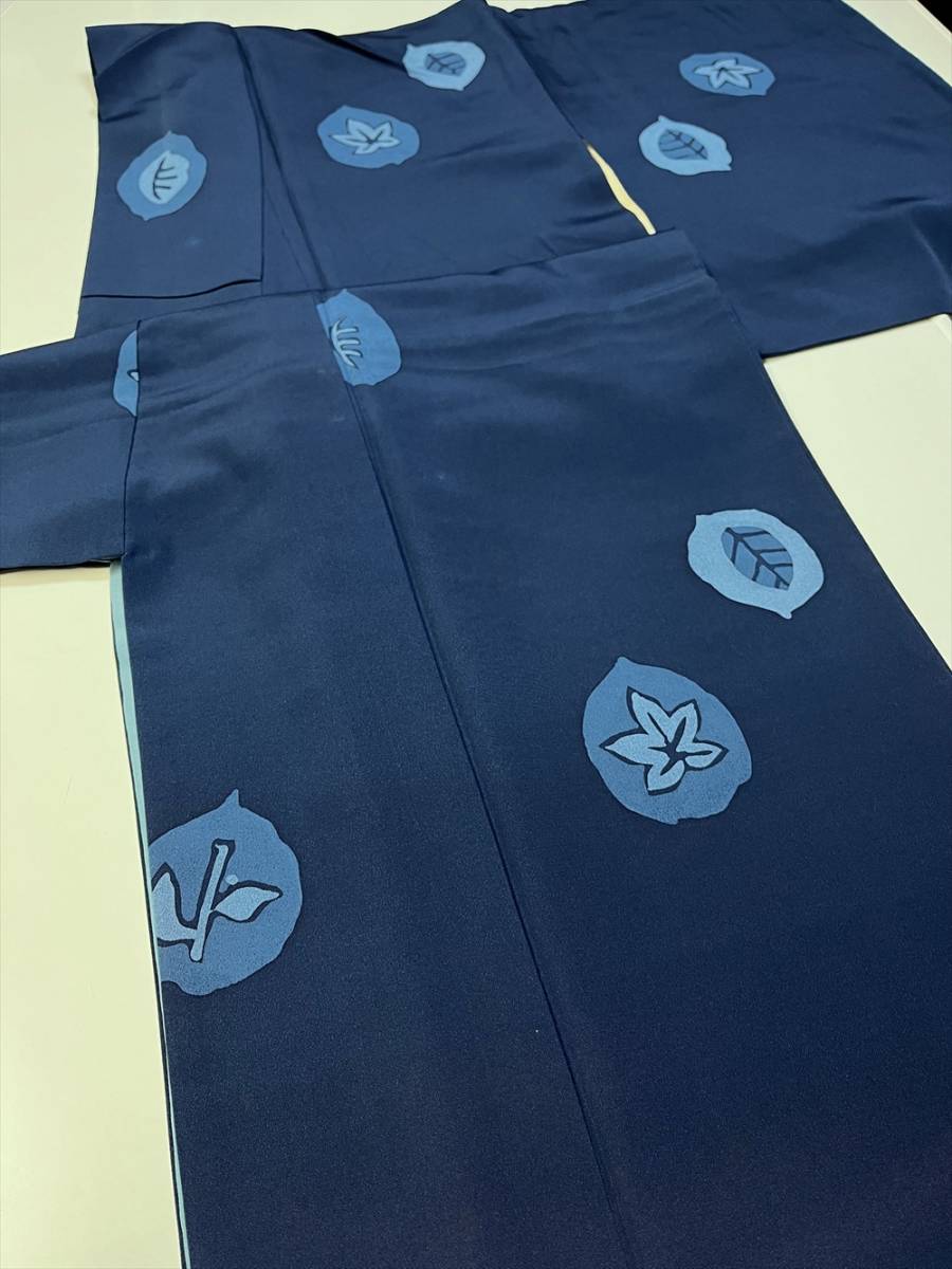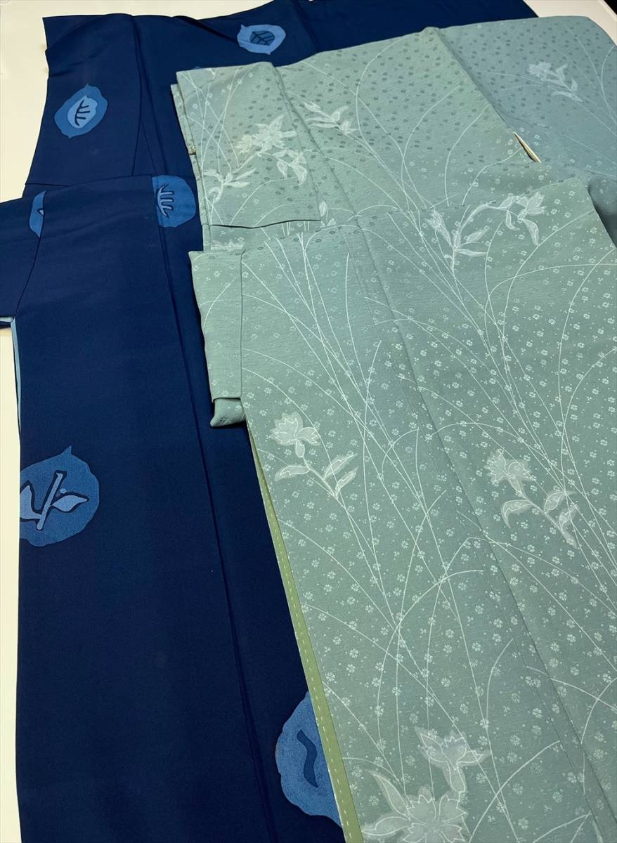 花とら●リサイクル着物 小紋 2枚まとめて リメイク 素材 紺 葉 ろうけつ染 薄灰緑 花 手描き風 着用可能 リメイク 231203