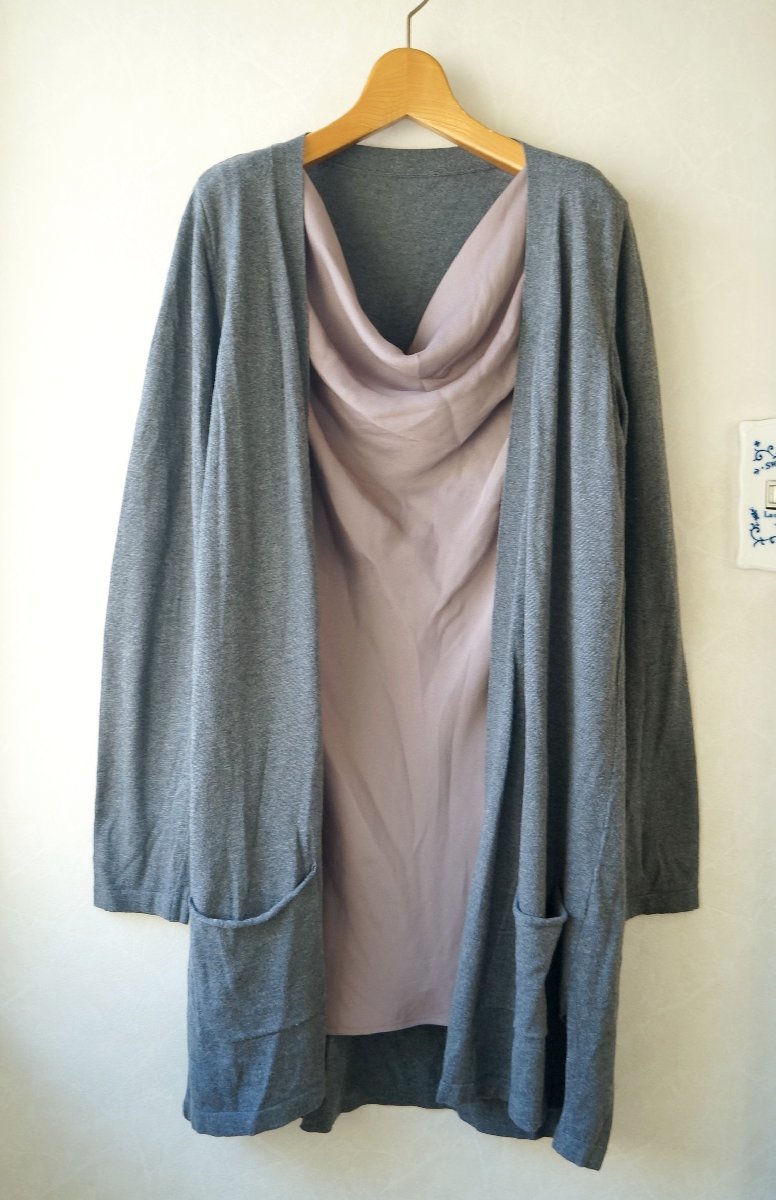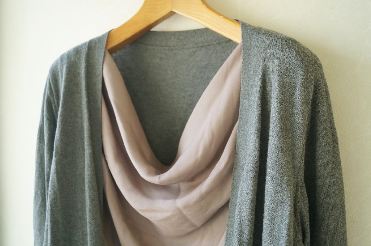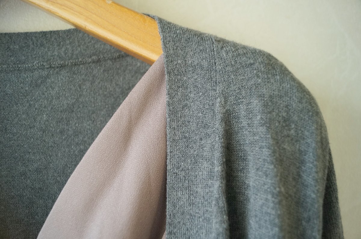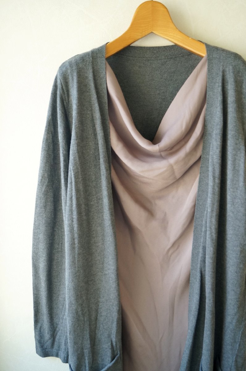 フロント部分のみ生地を切り替えて、ドレープトップスとカーディガンの