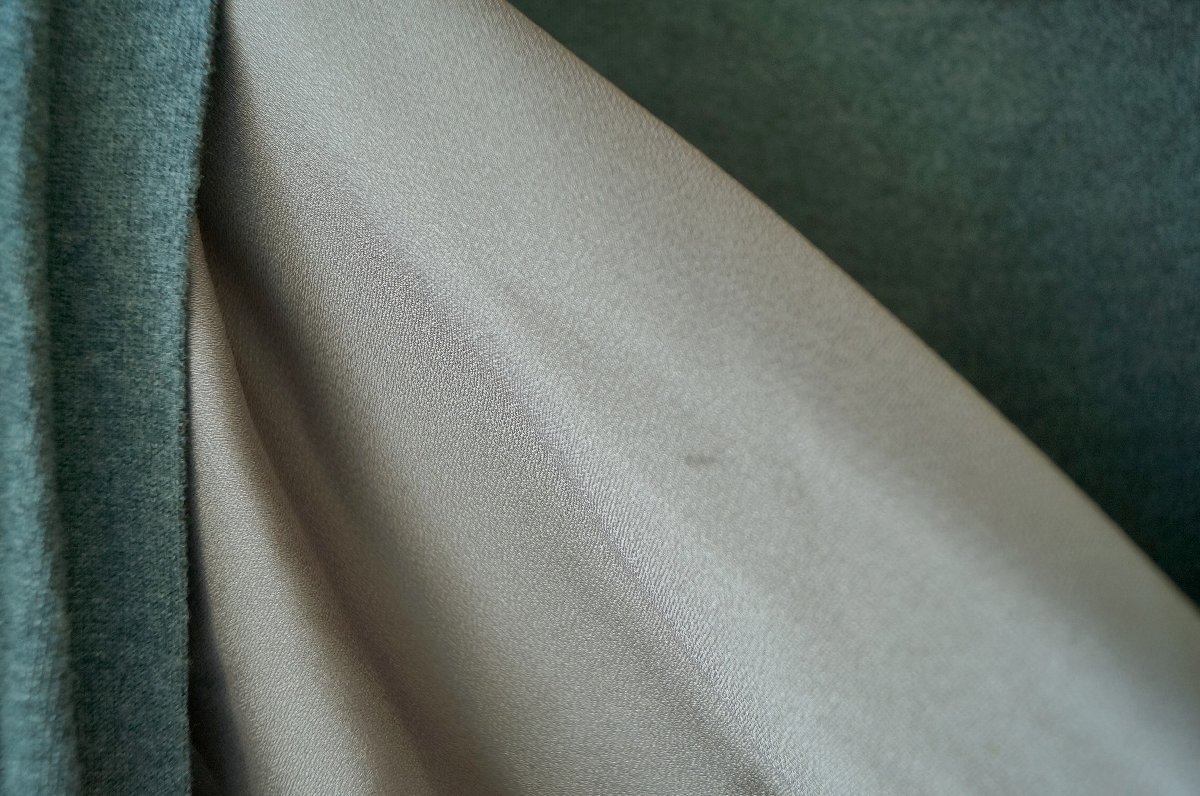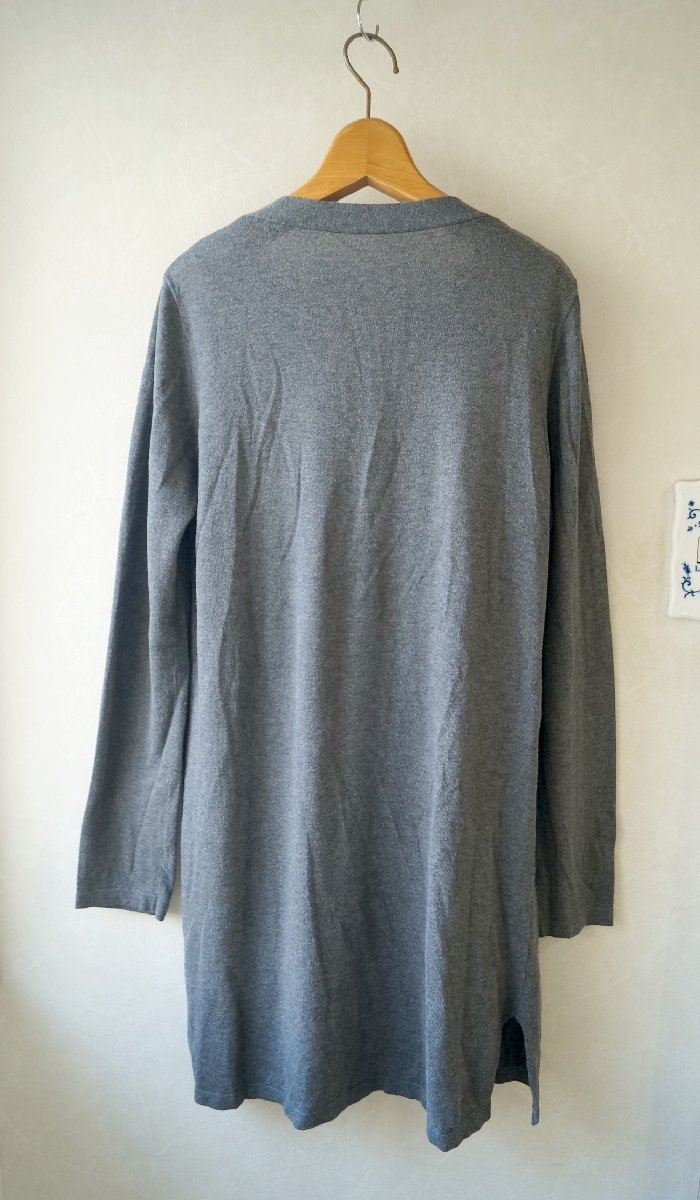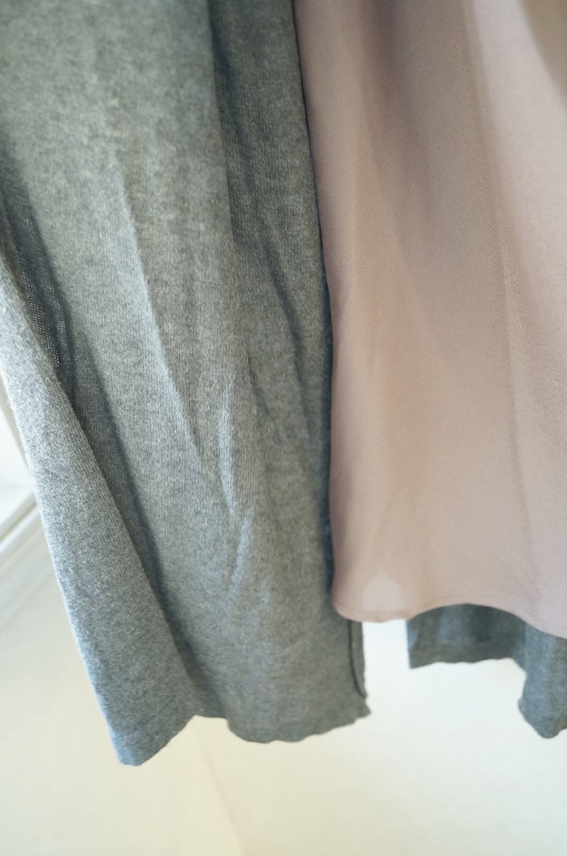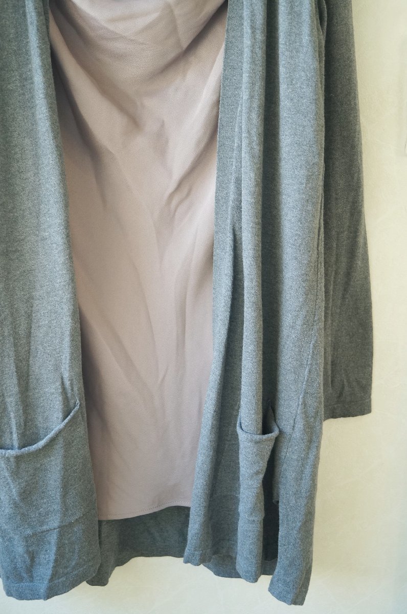 フロント部分のみ生地を切り替えて、ドレープトップスとカーディガンの