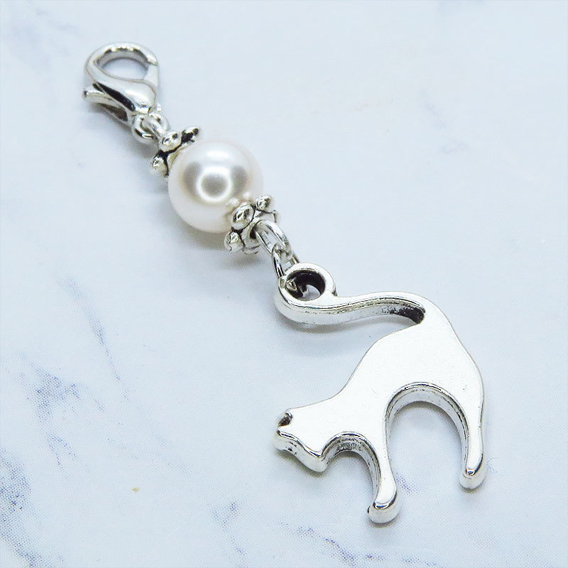 アンティークシルバーの跳ね猫モチーフとクリスタルホワイトのスワロフスキーパールを組み合わせたチャームです