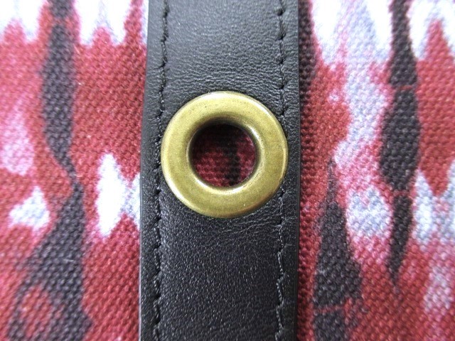 色は表現しにくいのですが、青を加えたようなボルドー(見る方や光の当たり方等によっては赤味の強い紫といった風に感じられるかもしれません)、それと白・黒・グレーを組み合わせた色合いで、レザー部分は黒にアンティーク感のあるハトメです。