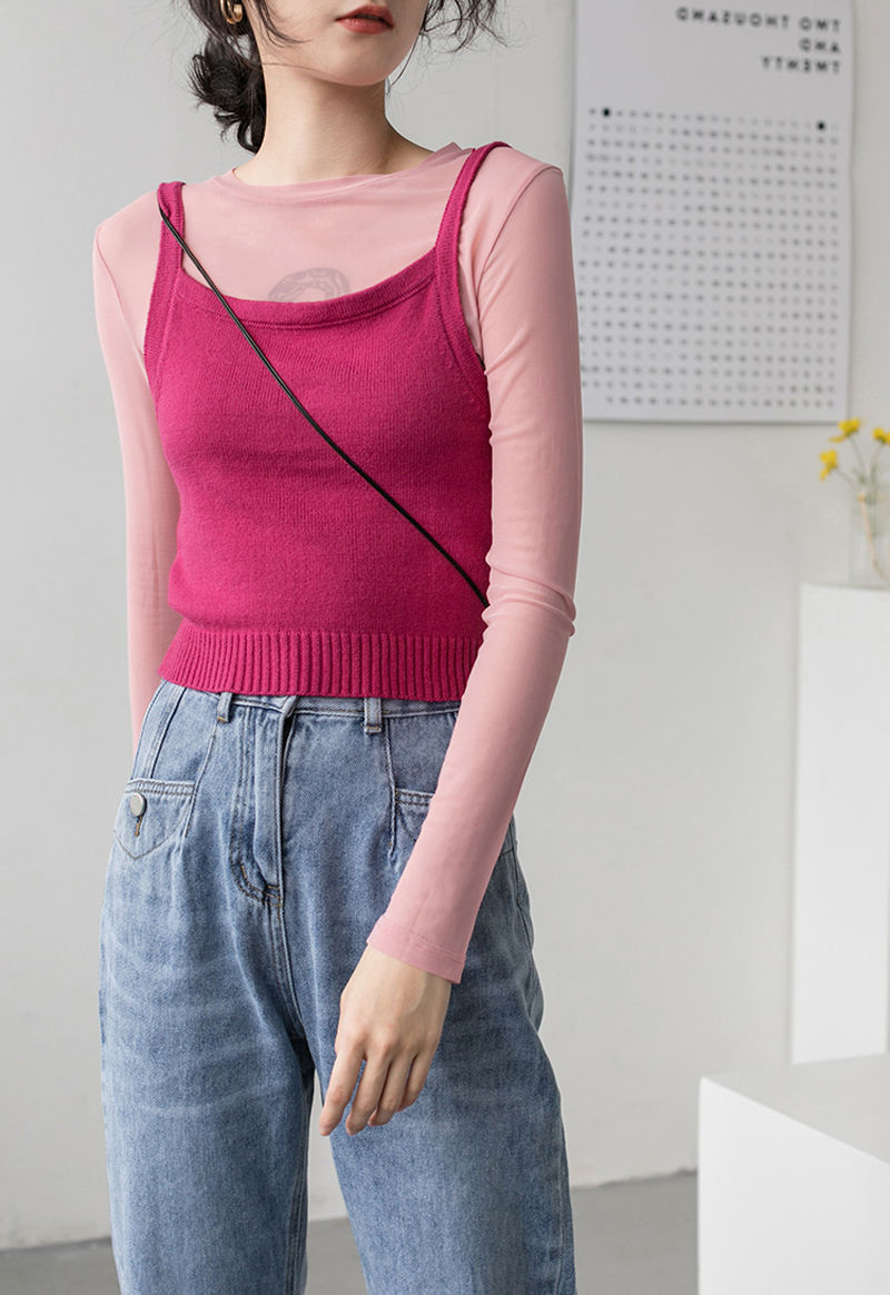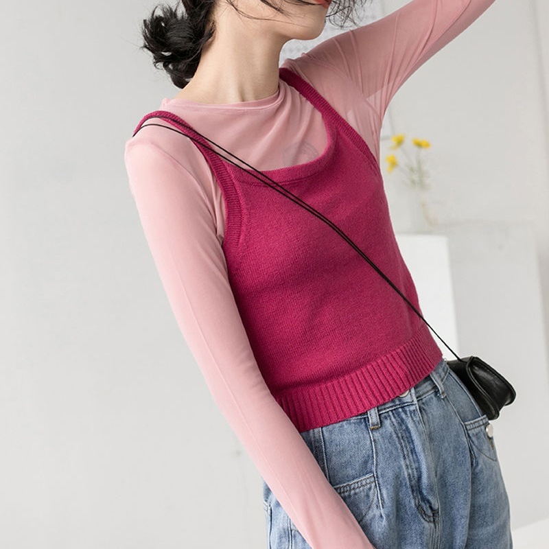 送料無料★新品 丸首 シアーカットソー コーデ万能 シースルーインナー シアー 透け感★ピンク | ||||
