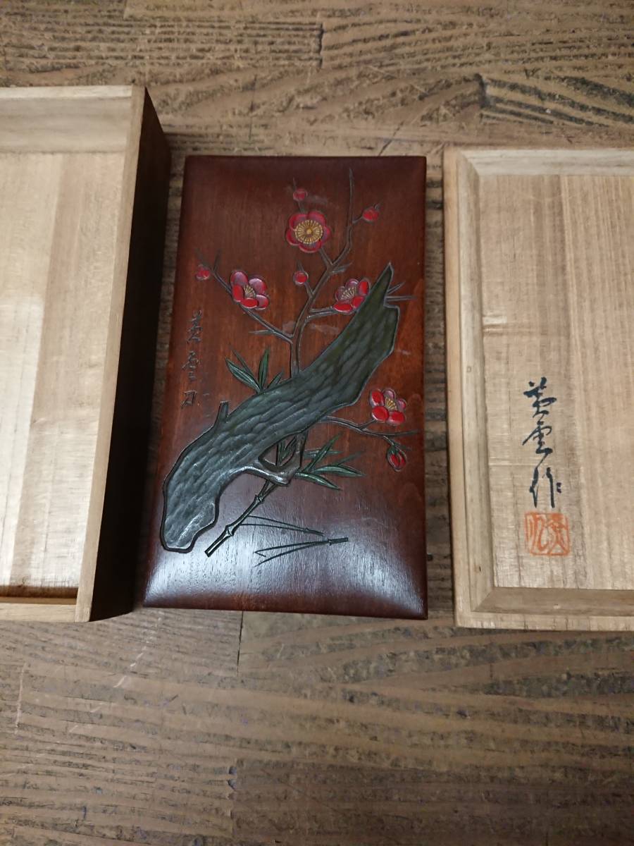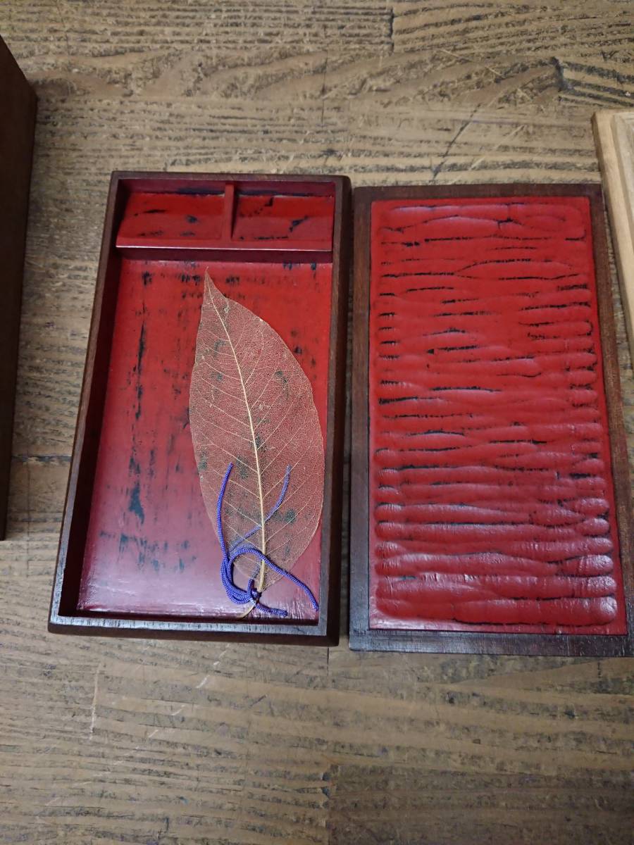 時代の木製 彫刻 根来塗り仕上げの小物入れです。縦19,5cm横10,8cm高さ2cm素晴らしい道具蓋物です。送料全国一律1500円